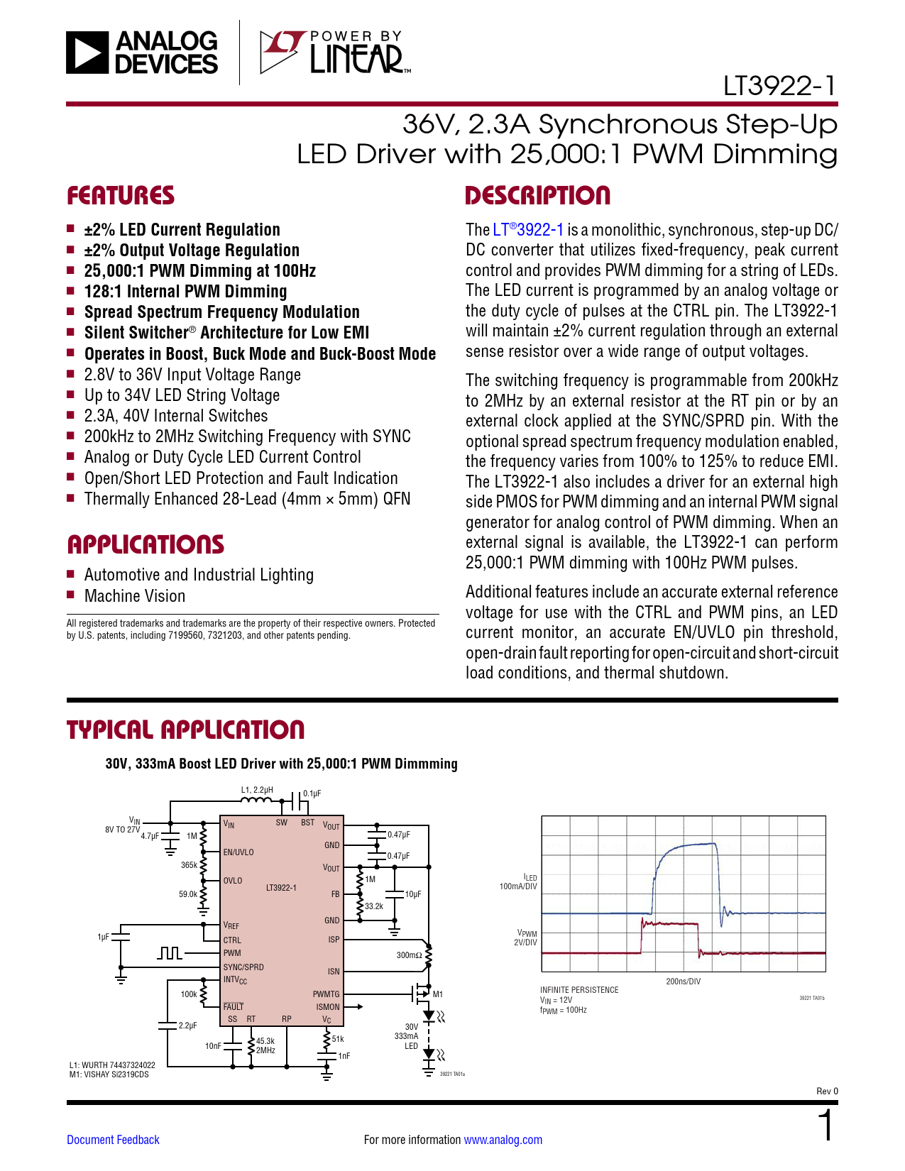 LT3922-1 36V, 2.3A Synchronous Step-Up LED Driver with 25,000:1 PWM Dimming