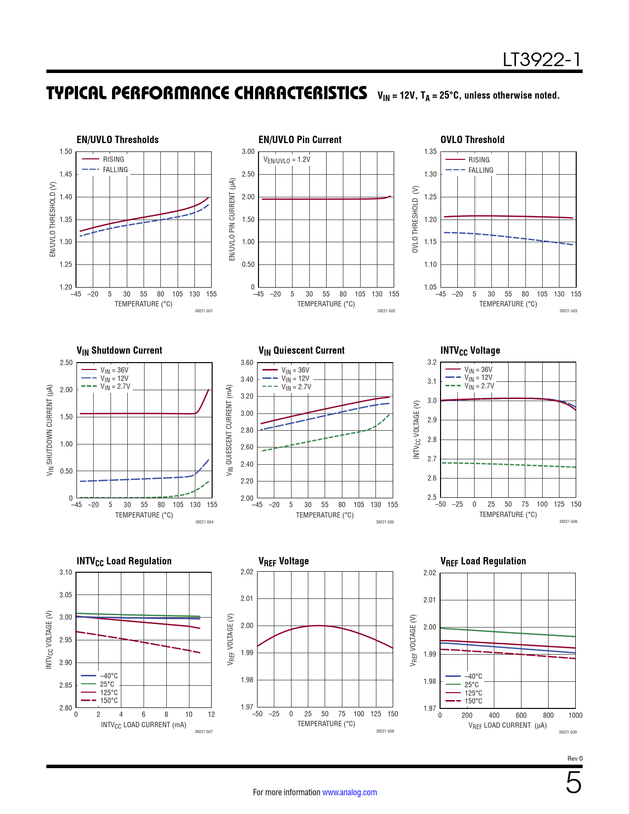 3.10 2.02 2.02 3.05 2.01 2.01 3.00 2.00 2.00 TAGE (V) 2.95 TAGE (V) TAGE (V) VOL VOL VOL V CC 1.99 1.99 2.90 INT V REF V REF –40°C 1.98 –40°C 2.85 25°C 1.98 25°C 125°C 125°C 150°C 150°C 2.80 1.97 1.97 0 2 4 6 8 10 12 –50 –25 0 25 50 75 100 125 150 0 200 400 600 800 1000 INTVCC LOAD CURRENT (mA) TEMPERATURE (°C) VREF LOAD CURRENT (µA) 39221 G07 39221 G08 39221 G09 Rev 0 For more information www.analog.com 5 Document Outline FEATURES DESCRIPTION APPLICATIONS TYPICAL APPLICATION ABSOLUTE MAXIMUM RATINGS PIN CONFIGURATION ORDER INFORMATION ELECTRICAL CHARACTERISTICS TYPICAL PERFORMANCE CHARACTERISTICS PIN FUNCTIONS BLOCK DIAGRAM OPERATION APPLICATIONS INFORMATION TYPICAL APPLICATIONS PACKAGE DESCRIPTION TYPICAL APPLICATION RELATED PARTS