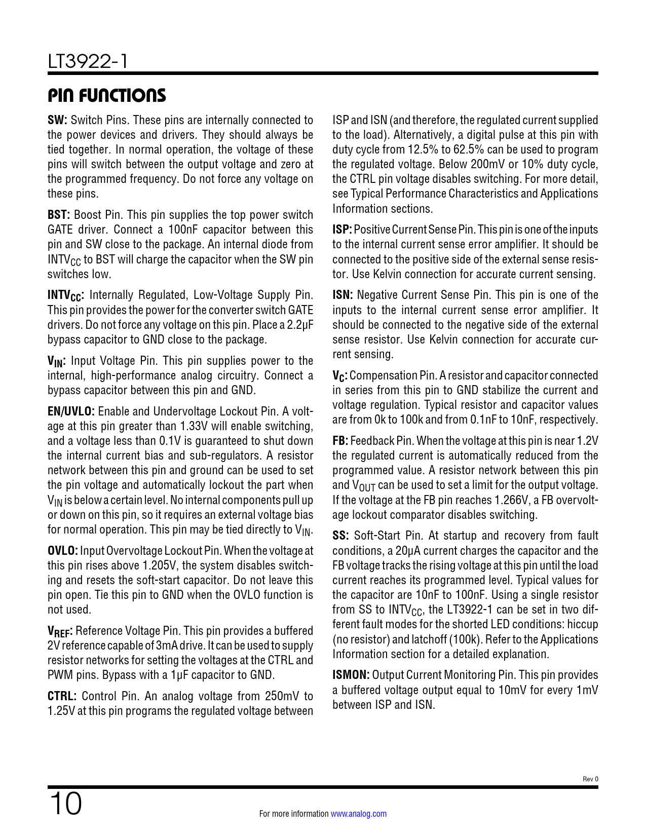 PIN FUNCTIONS SW:. BST:. ISP:. INTVCC:. ISN:. IN:. VC:. EN/UVLO:. FB:. SS:. OVLO:. REF:. ISMON:. CTRL: