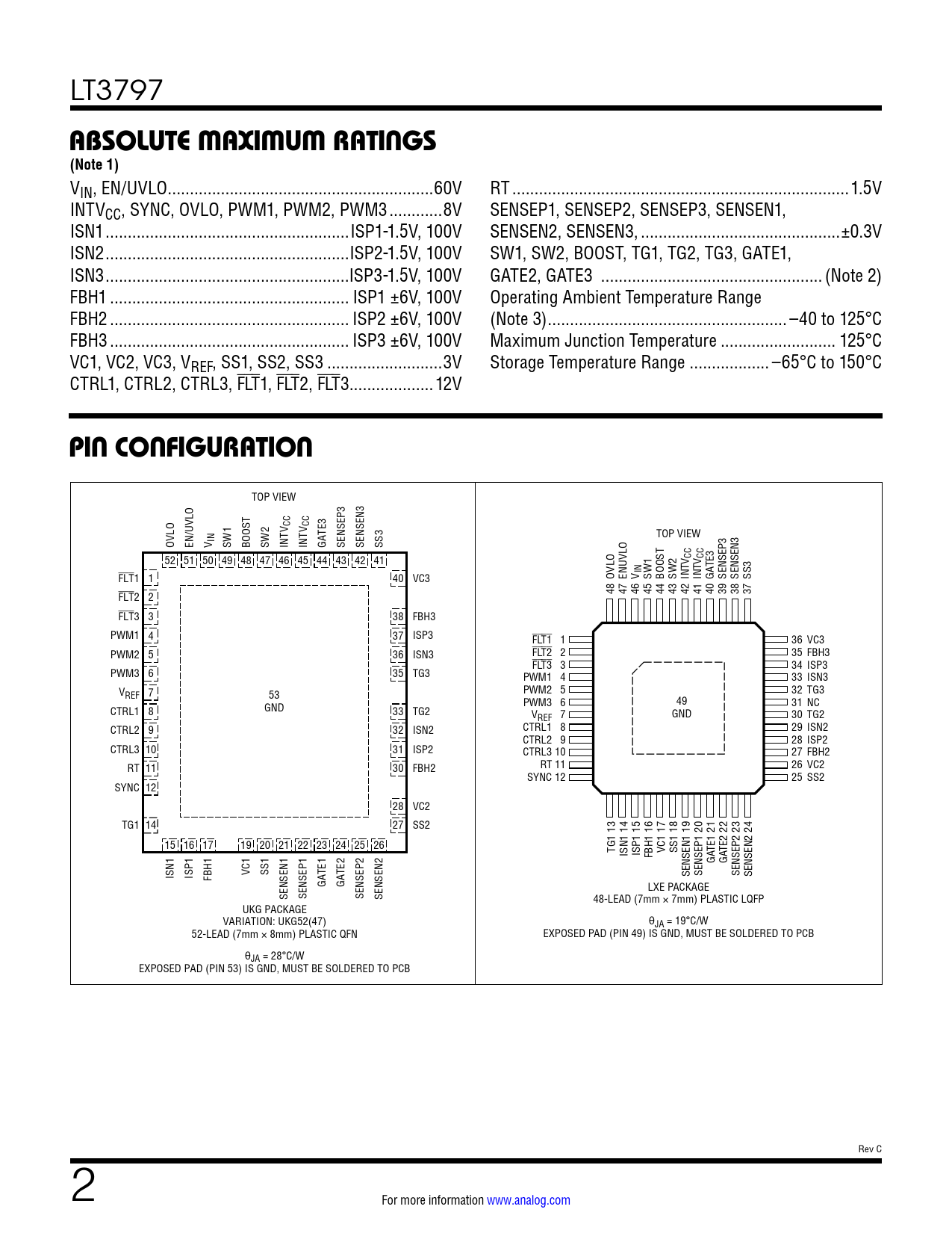 TOP VIEW CC CC TOP VIEW OVLO EN/UVLO V IN SW1 BOOST SW2 INTV INTV GATE3 SENSEP3 SENSEN3 SS3 52 51 50 49 48 47 46 45 44 43 42 41 V CC V CC TE3 FLT1 1 40 VC3 OVLO ENUVLO V IN SW1 BOOST SW2 INT INT GA SENSEP3 SENSEN3 SS3 48 47 46 45 44 43 42 41 40 39 38 37 FLT2 2 FLT3 3 38 FBH3 PWM1 4 37 ISP3 FLT1 1 36 VC3 PWM2 5 36 ISN3 FLT2 2 35 FBH3 FLT3 3 34 ISP3 PWM3 6 35 TG3 PWM1 4 33 ISN3 VREF 7 53 PWM2 5 32 TG3 GND PWM3 6 49 31 NC CTRL1 8 33 TG2 VREF 7 GND 30 TG2 CTRL2 9 32 ISN2 CTRL1 8 29 ISN2 CTRL2 9 28 ISP2 CTRL3 10 31 ISP2 CTRL3 10 27 FBH2 RT 11 30 FBH2 RT 11 26 VC2 SYNC 12 25 SS2 SYNC 12 28 VC2 TG1 14 27 SS2 13 14 15 16 17 18 19 20 21 22 23 24 15 16 17 19 20 21 22 23 24 25 26 TG1 ISN1 ISP1 FBH1 VC1 SS1 TE1 TE2 GA GA ISN1 ISP1 FBH1 VC1 SS1 SENSEN1 SENSEP1 SENSEP2 SENSEN2 GATE1 GATE2 LXE PACKAGE SENSEN1 SENSEP1 SENSEP2 SENSEN2 48-LEAD (7mm × 7mm) PLASTIC LQFP UKG PACKAGE VARIATION: UKG52(47) θJA = 19°C/W 52-LEAD (7mm × 8mm) PLASTIC QFN EXPOSED PAD (PIN 49) IS GND, MUST BE SOLDERED TO PCB θJA = 28°C/W EXPOSED PAD (PIN 53) IS GND, MUST BE SOLDERED TO PCB Rev C 2 For more information www.analog.com Document Outline Features Applications Description Typical Application Absolute Maximum Ratings Pin Configuration Electrical Characteristics Typical Performance Characteristics Pin Functions Block Diagram Operation Applications Information Revision History Typical Application Related Parts Features Applications Typical Application Description Absolute Maximum Ratings Pin Configuration Order Information Electrical Characteristics Typical Performance Characteristics Pin Functions Block Diagram Operation Applications Information Typical Applications Package Description Revision History Typical Application Related Parts