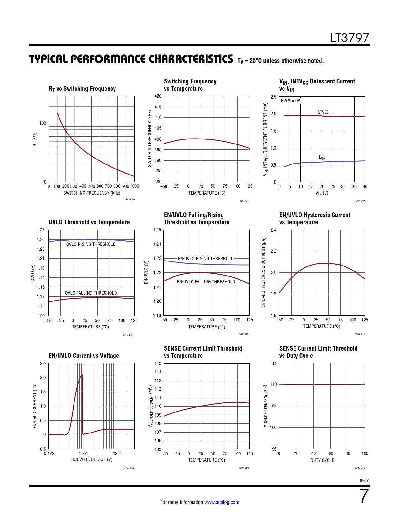 420 2.5 PWM = 0V 415 I 2.0 INTVCC 410 100 405 1.5 (kΩ) 400 R T 395 1.0 QUIESCENT CURRENT (mA) I 390 CC VIN SWITCHING FREQUENCY (kHz) 0.5 385 , INTV V IN 10 380 0 0 100 200 300 400 500 600 700 800 900 1000 –50 –25 0 25 50 75 100 125 0 5 10 15 20 25 30 35 40 SWITCHING FREQUENCY (kHz) TEMPERATURE (°C) VIN (V) 3797 G10 3797 G11 3797 G12