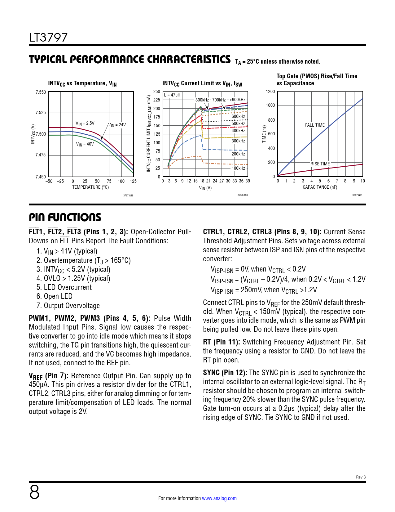 TYPICAL PERFORMANCE CHARACTERISTICS TA = 25°C unless otherwise noted. Top Gate (PMOS) Rise/Fall Time INTVCC vs Temperature, VIN INTVCC Current Limit vs VIN, fSW vs Capacitance