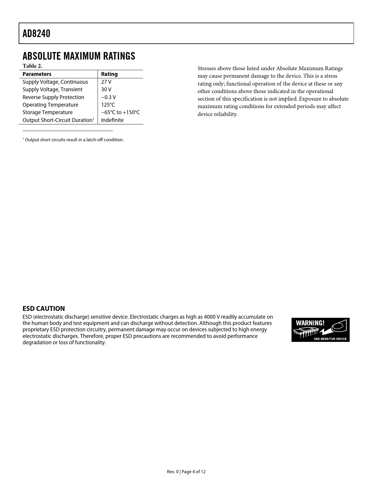 页数 / 页12 / 4 — AD8240. ABSOLUTE MAXIMUM RATINGS Table 2. Parameters Rating. ESD CAUTION