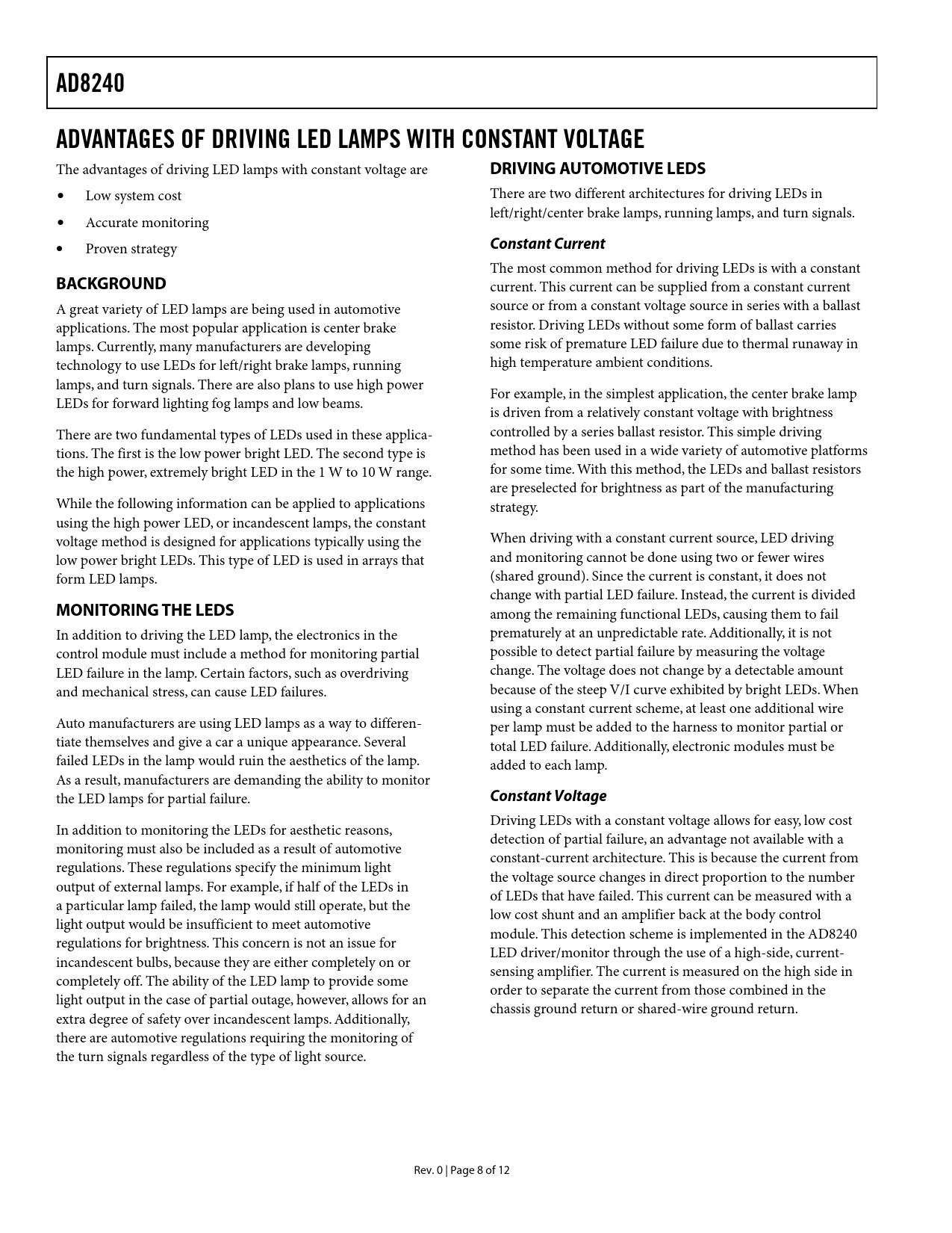 AD8240. ADVANTAGES OF DRIVING LED LAMPS WITH CONSTANT VOLTAGE. DRIVING AUTOMOTIVE LEDS. Constant Current. BACKGROUND