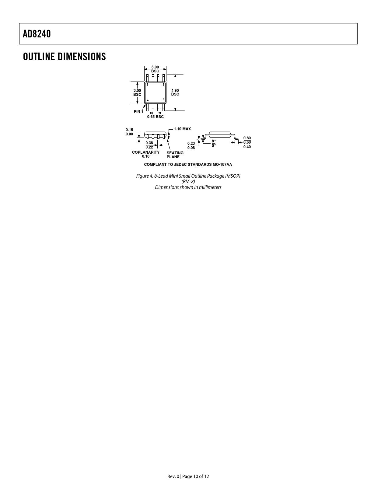 页数 / 页12 / 10 — AD8240. OUTLINE DIMENSIONS. 3.00. BSC. 4.90. PIN 1. 0.65 BSC. 0.15. 1.10 …