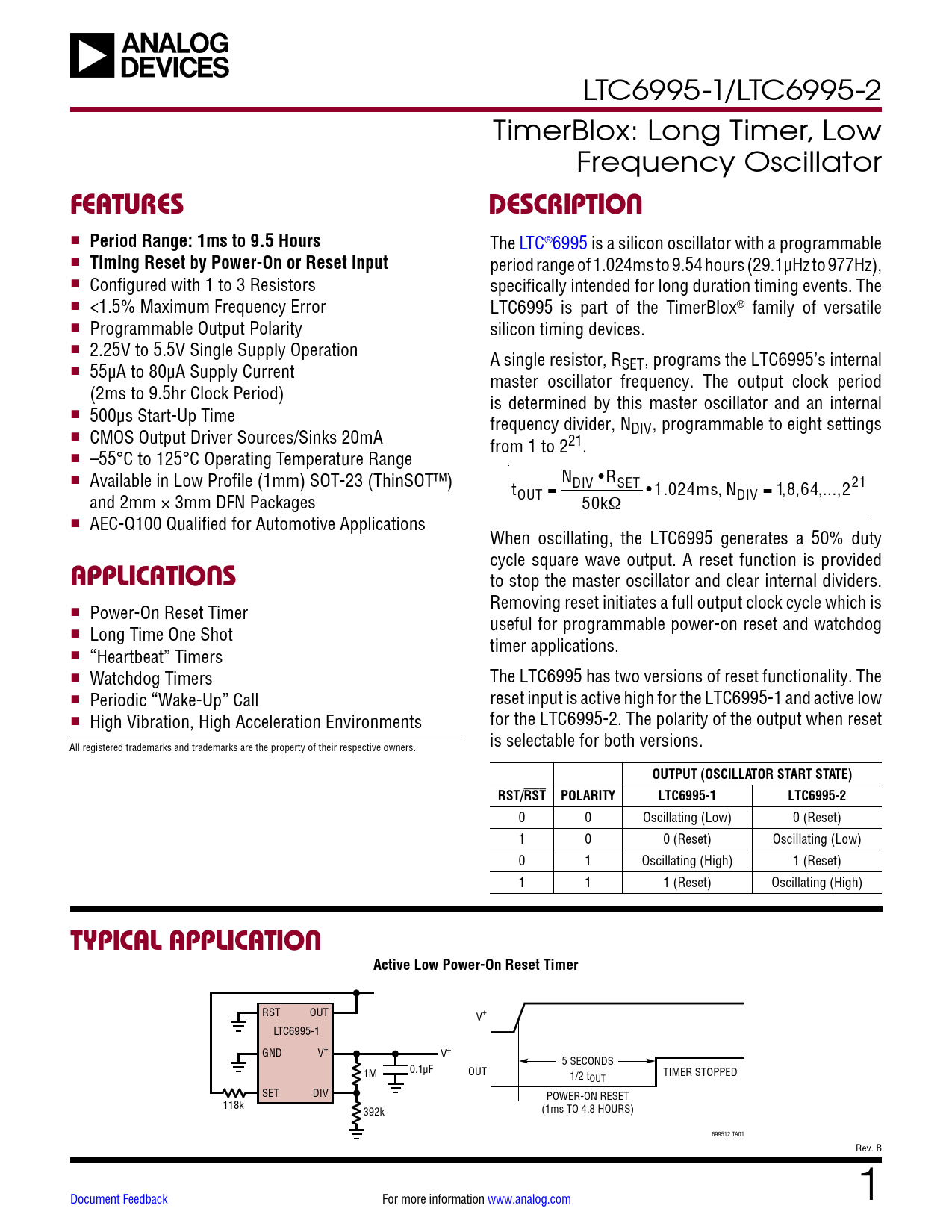 LTC6995-1/LTC6995-2 TimerBlox: Long Timer, Low Frequency Oscillator FEATURESDESCRIPTION n Period Range: 1ms to 9.5 Hours The LTC®6995 is a silicon oscillator with a programmable n Timing Reset by Power-On or Reset Input period range of 1.024ms to 9.54 hours (29.1µHz to 977Hz), n Configured with 1 to 3 Resistors specifically intended for long duration timing events. The n <1.5% Maximum Frequency Error LTC6995 is part of the TimerBlox® family of versatile n Programmable Output Polarity silicon timing devices. n 2.25V to 5.5V Single Supply Operation A single resistor, RSET , programs the LTC6995’s internal n 55µA to 80µA Supply Current master oscillator frequency. The output clock period (2ms to 9.5hr Clock Period) is determined by this master oscillator and an internal n 500µs Start-Up Time frequency divider, NDIV , programmable to eight settings n CMOS Output Driver Sources/Sinks 20mA from 1 to 221. n –55°C to 125°C Operating Temperature Range n Available in Low Profile (1mm) SOT-23 (ThinSOT™) N t DIV • RSET OUT = • 1.024ms, NDIV = 1,8,64,...,221 and 2mm × 3mm DFN Packages 50kΩ n AEC-Q100 Qualified for Automotive Applications When oscillating, the LTC6995 generates a 50% duty cycle square wave output. A reset function is provided APPLICATIONS to stop the master oscillator and clear internal dividers. Removing reset initiates a full output clock cycle which is n Power-On Reset Timer useful for programmable power-on reset and watchdog n Long Time One Shot timer applications. n “Heartbeat” Timers n Watchdog Timers The LTC6995 has two versions of reset functionality. The n Periodic “Wake-Up” Call reset input is active high for the LTC6995-1 and active low n High Vibration, High Acceleration Environments for the LTC6995-2. The polarity of the output when reset All registered trademarks and trademarks are the property of their respective owners. is selectable for both versions. OUTPUT (OSCILLATOR START STATE)RST/RST POLARITYLTC6995-1LTC6995-2 0 0 Oscillating (Low) 0 (Reset) 1 0 0 (Reset) Oscillating (Low) 0 1 Oscillating (High) 1 (Reset) 1 1 1 (Reset) Oscillating (High) TYPICAL APPLICATIONActive Low Power-On Reset Timer RST OUT V+ LTC6995-1 GND V+ V+ 5 SECONDS 0.1µF 1M OUT 1/2 t TIMER STOPPED OUT SET DIV POWER-ON RESET 118k 392k (1ms TO 4.8 HOURS) 699512 TA01 Rev. B Document Feedback 1 For more information www.analog.com Document Outline Features Applications Typical Application Description Absolute Maximum Ratings Pin Configuration Order Information Electrical Characteristics Typical Performance Characteristics Pin Functions Block Diagram Operation Applications Information Package Description Revision History Typical Application Related Parts