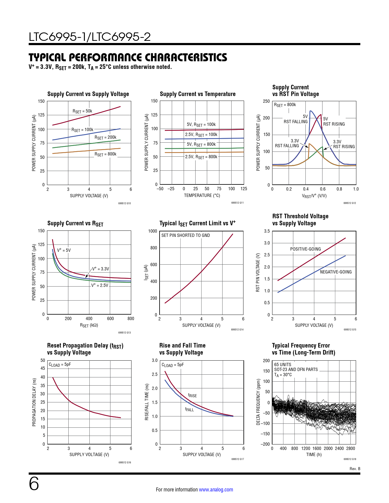 150 150 250 RSET = 800k RSET = 50k 125 125 200 5V RST FALLING 5V 5V, RSET = 100k RST RISING 100 RSET = 100k 100 2.5V, R R SET = 100k 150 SET = 200k Y CURRENT (µA) 75 75 3.3V 5V, R Y CURRENT (µA) 3.3V SET = 800k RST FALLING RST RISING R 100 50 SET = 800k 50 2.5V, RSET = 800k POWER SUPPL 50 25 POWER SUPPLY CURRENT (µA) 25 POWER SUPPL 0 0 0 2 3 4 5 6 –50 –25 0 25 50 75 100 125 0 0.2 0.4 0.6 0.8 1.0 SUPPLY VOLTAGE (V) TEMPERATURE (°C) VRST/V+ (V/V) 699512 G10 699512 G11 699512 G12