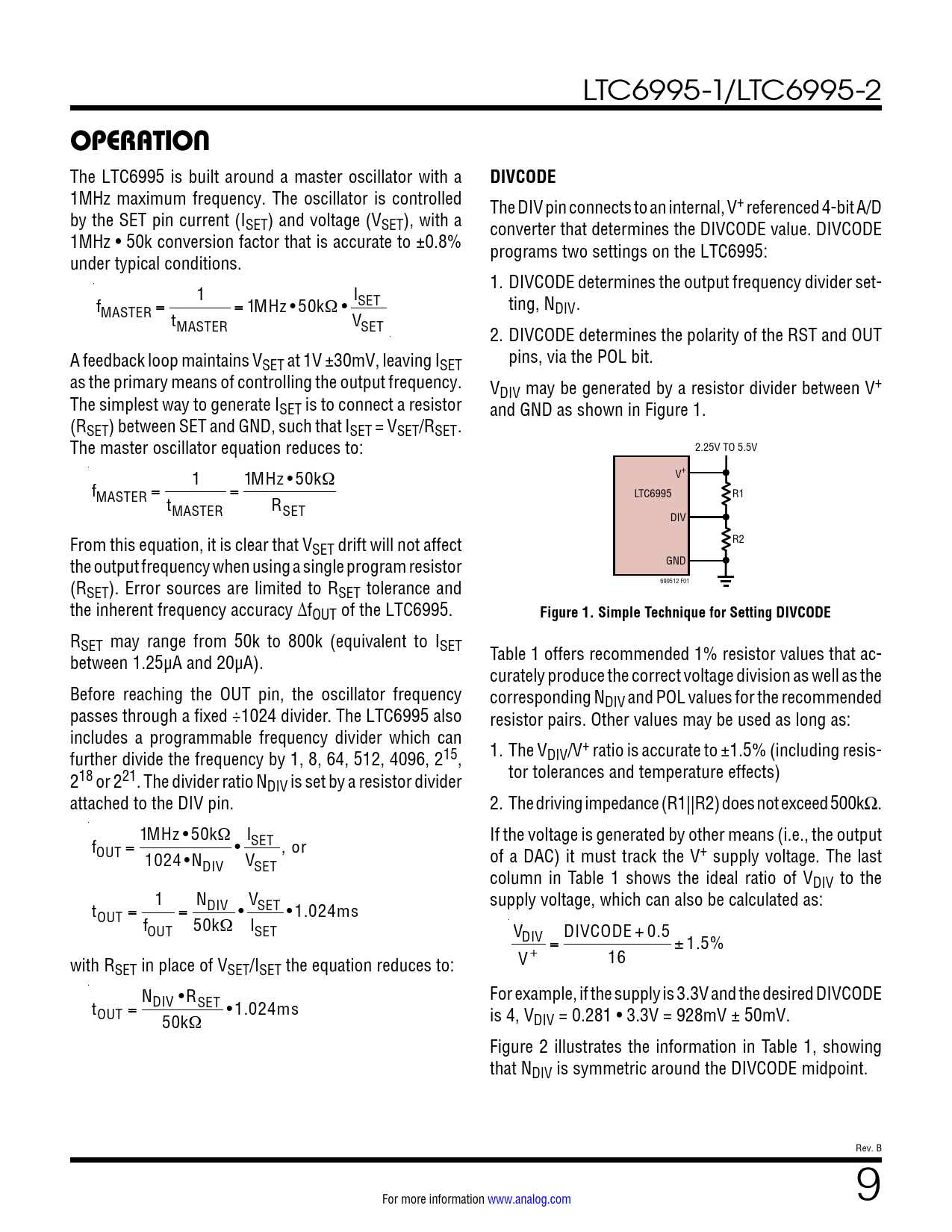 link to page 9 link to page 10 link to page 10 link to page 10 link to page 10 LTC6995-1/LTC6995-2 OPERATION The LTC6995 is built around a master oscillator with a DIVCODE 1MHz maximum frequency. The oscillator is controlled The DIV pin connects to an internal, V+ referenced 4-bit A/D by the SET pin current (ISET) and voltage (VSET), with a converter that determines the DIVCODE value. DIVCODE 1MHz • 50k conversion factor that is accurate to ±0.8% programs two settings on the LTC6995: under typical conditions. 1. DIVCODE determines the output frequency divider set- 1 I f SET ting, N MASTER = = 1MHz • 50kΩ • DIV . tMASTER VSET 2. DIVCODE determines the polarity of the RST and OUT A feedback loop maintains VSET at 1V ±30mV, leaving ISET pins, via the POL bit. as the primary means of controlling the output frequency. V The simplest way to generate I DIV may be generated by a resistor divider between V+ SET is to connect a resistor and GND as shown in Figure 1. (RSET) between SET and GND, such that ISET = VSET/RSET . The master oscillator equation reduces to: 2.25V TO 5.5V 1 1MHz • 50k V+ f Ω MASTER = = LTC6995 R1 tMASTER RSET DIV From this equation, it is clear that V R2 SET drift will not affect the output frequency when using a single program resistor GND (R 699512 F01 SET). Error sources are limited to RSET tolerance and the inherent frequency accuracy ∆fOUT of the LTC6995. Figure 1. Simple Technique for Setting DIVCODE RSET may range from 50k to 800k (equivalent to ISET between 1.25µA and 20µA). Table 1 offers recommended 1% resistor values that ac- curately produce the correct voltage division as well as the Before reaching the OUT pin, the oscillator frequency corresponding NDIV and POL values for the recommended passes through a fixed ÷1024 divider. The LTC6995 also resistor pairs. Other values may be used as long as: includes a programmable frequency divider which can further divide the frequency by 1, 8, 64, 512, 4096, 215, 1. The VDIV/V+ ratio is accurate to ±1.5% (including resis- 218 or 221. The divider ratio N tor tolerances and temperature effects) DIV is set by a resistor divider attached to the DIV pin. 2. The driving impedance (R1||R2) does not exceed 500kΩ. 1MHz • 50k I If the voltage is generated by other means (i.e., the output f Ω SET OUT = • , or 1024 •N of a DAC) it must track the V+ supply voltage. The last DIV VSET column in Table 1 shows the ideal ratio of VDIV to the 1 N V supply voltage, which can also be calculated as: t DIV SET OUT = = • •1.024ms fOUT 50kΩ ISET VDIV DIVCODE + 0.5 = ± 1.5% with R V + 16 SET in place of VSET/ISET the equation reduces to: N For example, if the supply is 3.3V and the desired DIVCODE t DIV • RSET OUT = • 1.024ms is 4, V 50kΩ DIV = 0.281 • 3.3V = 928mV ± 50mV. Figure 2 illustrates the information in Table 1, showing that NDIV is symmetric around the DIVCODE midpoint. Rev. B 9 For more information www.analog.com Document Outline Features Applications Typical Application Description Absolute Maximum Ratings Pin Configuration Order Information Electrical Characteristics Typical Performance Characteristics Pin Functions Block Diagram Operation Applications Information Package Description Revision History Typical Application Related Parts