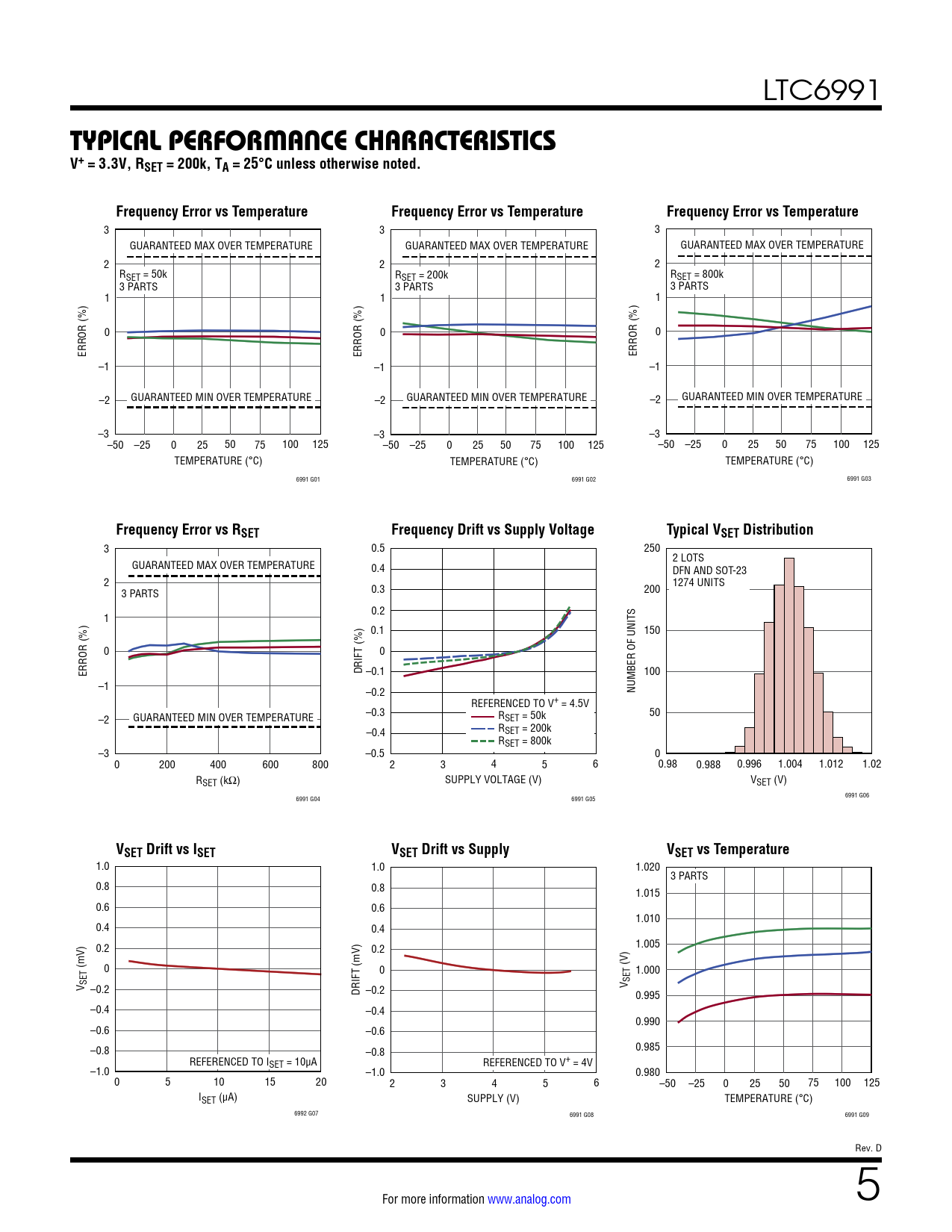 LTC6991 TYPICAL PERFORMANCE CHARACTERISTICSV+ = 3.3V, RSET = 200k, TA = 25°C unless otherwise noted.Frequency Error vs TemperatureFrequency Error vs TemperatureFrequency Error vs Temperature 3 3 3 GUARANTEED MAX OVER TEMPERATURE GUARANTEED MAX OVER TEMPERATURE GUARANTEED MAX OVER TEMPERATURE 2 2 2 RSET = 50k RSET = 200k RSET = 800k 3 PARTS 3 PARTS 3 PARTS 1 1 1 0 0 0 ERROR (%) ERROR (%) ERROR (%) –1 –1 –1 –2 GUARANTEED MIN OVER TEMPERATURE –2 GUARANTEED MIN OVER TEMPERATURE –2 GUARANTEED MIN OVER TEMPERATURE –3 –3 –3 –50 –25 0 25 50 75 100 125 –50 –25 0 25 50 75 100 125 –50 –25 0 25 50 75 100 125 TEMPERATURE (°C) TEMPERATURE (°C) TEMPERATURE (°C) 6991 G01 6991 G02 6991 G03 Frequency Error vs RSETFrequency Drift vs Supply VoltageTypical VSET Distribution 3 0.5 250 2 LOTS GUARANTEED MAX OVER TEMPERATURE 0.4 DFN AND SOT-23 2 0.3 200 1274 UNITS 3 PARTS 0.2 1 0.1 150 0 0 ERROR (%) DRIFT (%) –0.1 100 –1 NUMBER OF UNITS –0.2 REFERENCED TO V+ = 4.5V –0.3 50 –2 GUARANTEED MIN OVER TEMPERATURE RSET = 50k –0.4 RSET = 200k RSET = 800k –3 –0.5 0 0 200 400 600 800 2 3 4 5 6 0.98 0.988 0.996 1.004 1.012 1.02 R SUPPLY VOLTAGE (V) V SET (kΩ) SET (V) 6991 G06 6991 G04 6991 G05 VSET Drift vs ISETVSET Drift vs SupplyVSET vs Temperature 1.0 1.0 1.020 3 PARTS 0.8 0.8 1.015 0.6 0.6 1.010 0.4 0.4 0.2 0.2 1.005 (mV) 0 0 (V) 1.000 V SET –0.2 V SET DRIFT (mV) –0.2 0.995 –0.4 –0.4 0.990 –0.6 –0.6 –0.8 –0.8 0.985 REFERENCED TO ISET = 10µA REFERENCED TO V+ = 4V –1.0 –1.0 0.980 0 5 10 15 20 2 3 4 5 6 –50 –25 0 25 50 75 100 125 ISET (µA) SUPPLY (V) TEMPERATURE (°C) 6992 G07 6991 G08 6991 G09 Rev. D For more information www.analog.com 5 Document Outline Features Applications Typical Application Description Absolute Maximum Ratings Pin Configuration Order Information Electrical Characteristics Typical Performance Characteristics Pin Functions Block Diagram Operation Applications Information Typical Applications Package Description Revision History Typical Application Related Parts