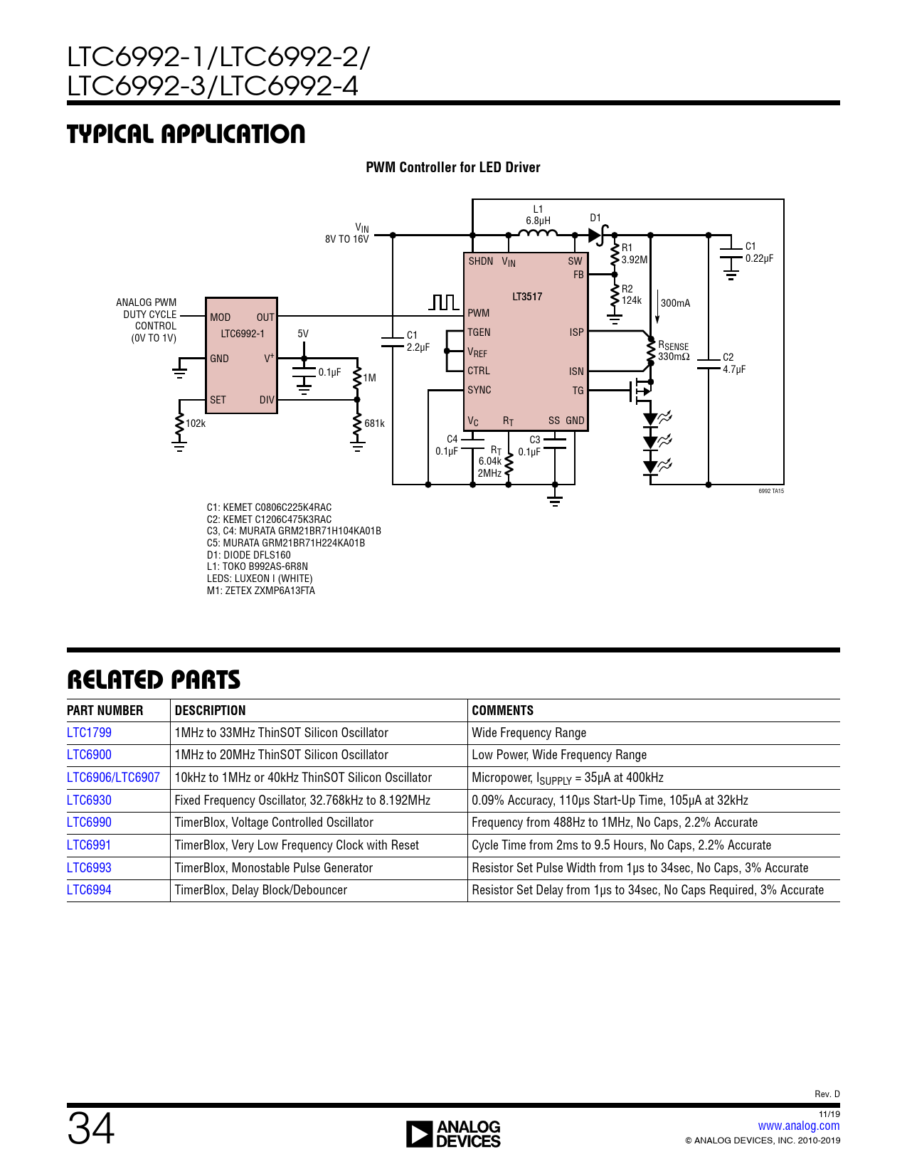 页数 / 页34 / 34 — TYPICAL APPLICATION. PWM Controller for LED Driver. RELATED PARTS PART …