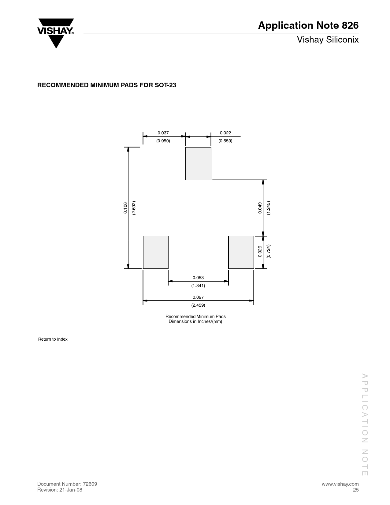 0.037 0.022 (0.950) (0.559) 0.106 (2.692) 0.049 (1.245) 0.029 (0.724) 0.053 (1.341) 0.097 (2.459) Recommended Minimum Pads Dimensions in Inches/(mm) Return to Index Return to Index APPLICATION NOTE Document Number: 72609 www.vishay.com Revision: 21-Jan-08 25