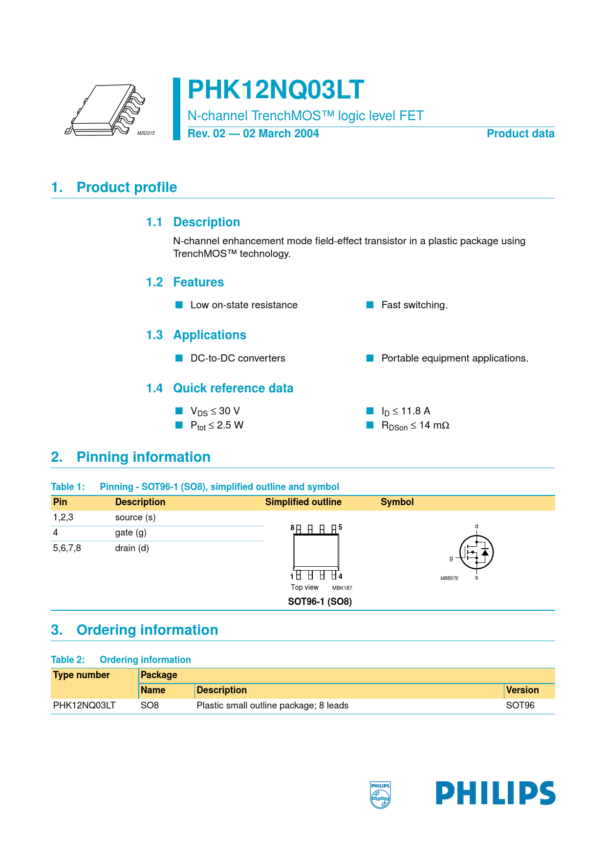 PHK12NQ03LT. Rev. 02 — 02 March 2004. Product data. Product profile. 1.1 Description. 1.2 Features. 1.3 Applications