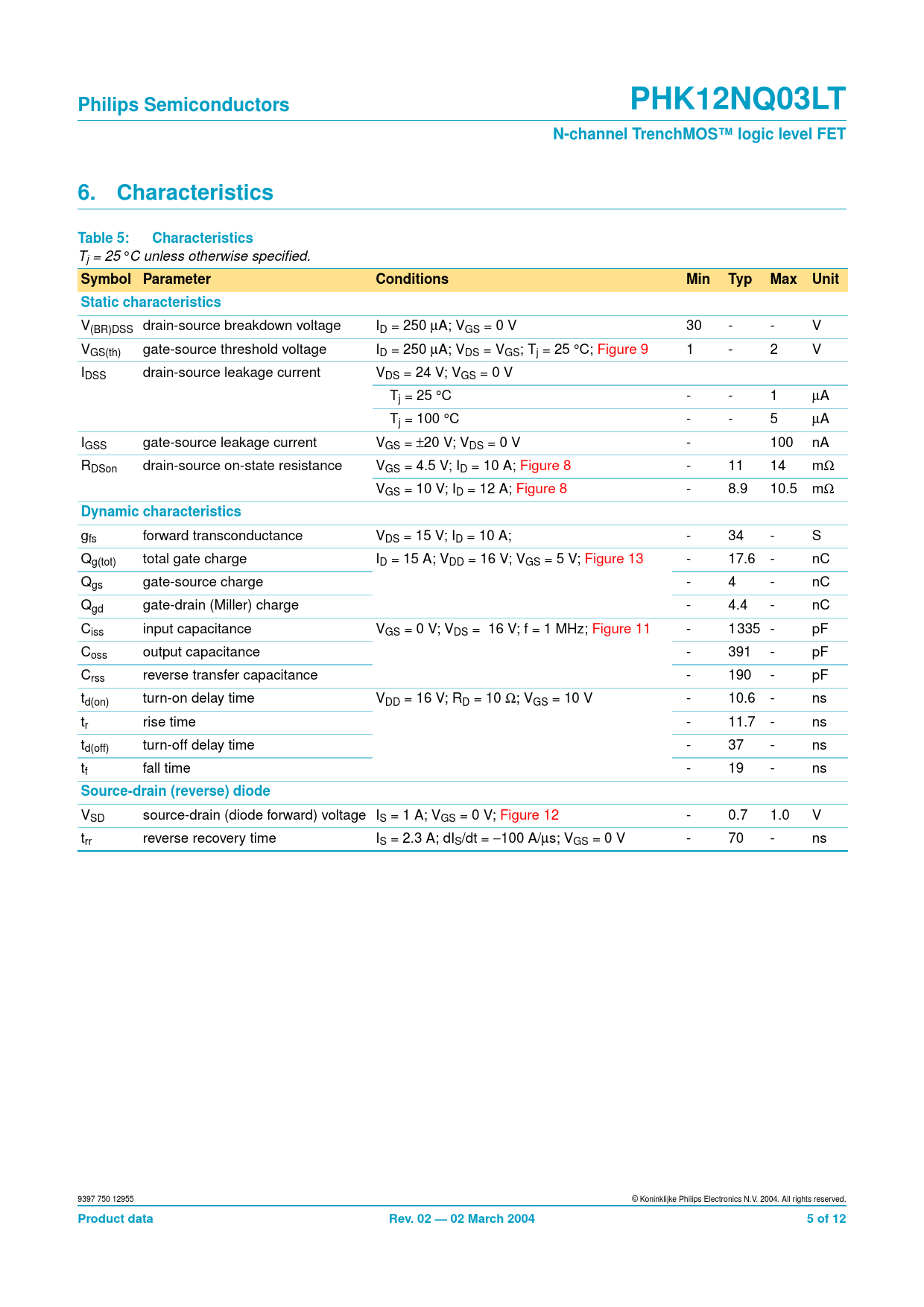 Philips Semiconductors. PHK12NQ03LT. N-channel TrenchMOS™ logic level FET. Characteristics. Table 5:. Symbol Parameter. Conditions
