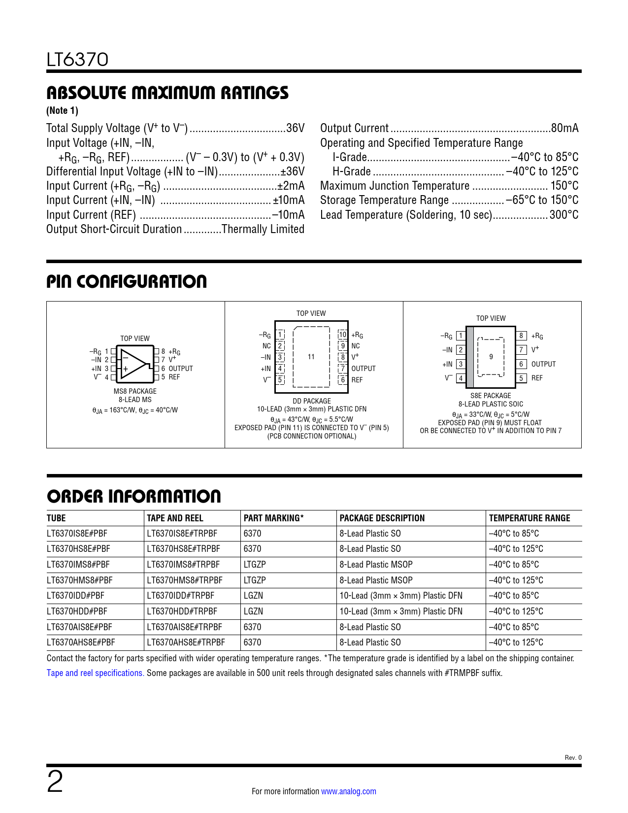 LT6370IS8E#PBF LT6370IS8E#TRPBF 6370 8-Lead Plastic SO –40°C to 85°C LT6370HS8E#PBF LT6370HS8E#TRPBF 6370 8-Lead Plastic SO –40°C to 125°C LT6370IMS8#PBF LT6370IMS8#TRPBF LTGZP 8-Lead Plastic MSOP –40°C to 85°C LT6370HMS8#PBF LT6370HMS8#TRPBF LTGZP 8-Lead Plastic MSOP –40°C to 125°C LT6370IDD#PBF LT6370IDD#TRPBF LGZN 10-Lead (3mm × 3mm) Plastic DFN –40°C to 85°C LT6370HDD#PBF LT6370HDD#TRPBF LGZN 10-Lead (3mm × 3mm) Plastic DFN –40°C to 125°C LT6370AIS8E#PBF LT6370AIS8E#TRPBF 6370 8-Lead Plastic SO –40°C to 85°C LT6370AHS8E#PBF LT6370AHS8E#TRPBF 6370 8-Lead Plastic SO –40°C to 125°C Contact the factory for parts specified with wider operating temperature ranges. *The temperature grade is identified by a label on the shipping container. Tape and reel specifications. Some packages are available in 500 unit reels through designated sales channels with #TRMPBF suffix. Rev. 0 2 For more information www.analog.com Document Outline Features Applications Typical Application Description Absolute Maximum Ratings Pin Configuration Order Information Electrical Characteristics Typical Performance Characteristics Pin Functions Simplified Block Diagram Theory of Operation Applications Information Typical Applications Package Description Typical Application Related Parts