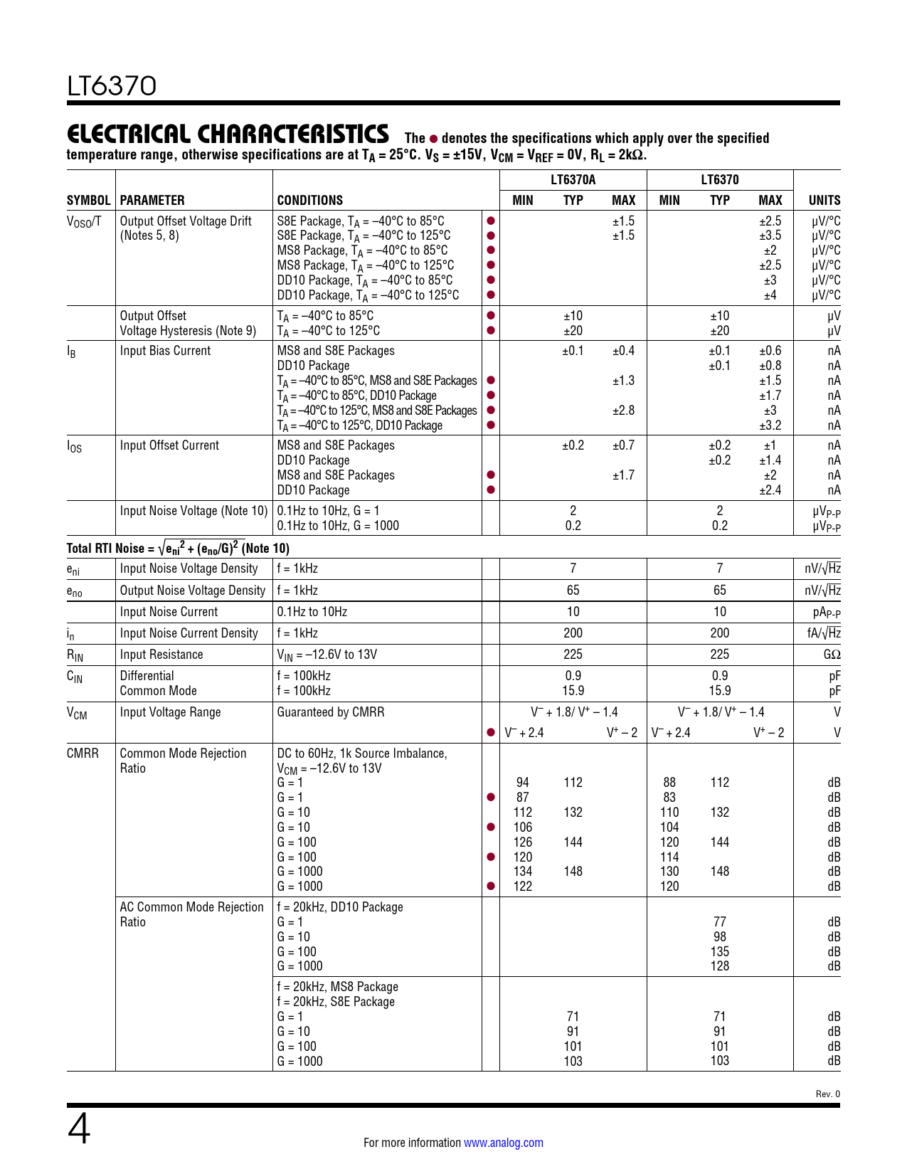 LT6370 ELECTRICAL CHARACTERISTICSThe l denotes the specifications which apply over the specifiedtemperature range, otherwise specifications are at TA = 25°C. VS = ±15V, VCM = VREF = 0V, RL = 2kΩ.LT6370ALT6370SYMBOL PARAMETERCONDITIONSMINTYPMAXMINTYPMAXUNITS VOSO/T Output Offset Voltage Drift S8E Package, TA = –40°C to 85°C l ±1.5 ±2.5 μV/°C (Notes 5, 8) S8E Package, TA = –40°C to 125°C l ±1.5 ±3.5 μV/°C MS8 Package, TA = –40°C to 85°C l ±2 μV/°C MS8 Package, TA = –40°C to 125°C l ±2.5 μV/°C DD10 Package, TA = –40°C to 85°C l ±3 μV/°C DD10 Package, TA = –40°C to 125°C l ±4 μV/°C Output Offset TA = –40°C to 85°C l ±10 ±10 μV Voltage Hysteresis (Note 9) TA = –40°C to 125°C l ±20 ±20 μV IB Input Bias Current MS8 and S8E Packages ±0.1 ±0.4 ±0.1 ±0.6 nA DD10 Package ±0.1 ±0.8 nA TA = –40°C to 85°C, MS8 and S8E Packages l ±1.3 ±1.5 nA TA = –40°C to 85°C, DD10 Package l ±1.7 nA TA = –40°C to 125°C, MS8 and S8E Packages l ±2.8 ±3 nA TA = –40°C to 125°C, DD10 Package l ±3.2 nA IOS Input Offset Current MS8 and S8E Packages ±0.2 ±0.7 ±0.2 ±1 nA DD10 Package ±0.2 ±1.4 nA MS8 and S8E Packages l ±1.7 ±2 nA DD10 Package l ±2.4 nA Input Noise Voltage (Note 10) 0.1Hz to 10Hz, G = 1 2 2 μVP-P 0.1Hz to 10Hz, G = 1000 0.2 0.2 μVP-P Total RTI Noise = √ e 2ni + (eno/G)2 (Note 10) eni Input Noise Voltage Density f = 1kHz 7 7 nV/√Hz eno Output Noise Voltage Density f = 1kHz 65 65 nV/√Hz Input Noise Current 0.1Hz to 10Hz 10 10 pAP-P in Input Noise Current Density f = 1kHz 200 200 fA/√Hz RIN Input Resistance VIN = –12.6V to 13V 225 225 GΩ CIN Differential f = 100kHz 0.9 0.9 pF Common Mode f = 100kHz 15.9 15.9 pF VCM Input Voltage Range Guaranteed by CMRR V– + 1.8/ V+ – 1.4 V– + 1.8/ V+ – 1.4 V l V– + 2.4 V+ – 2 V– + 2.4 V+ – 2 V CMRR Common Mode Rejection DC to 60Hz, 1k Source Imbalance, Ratio VCM = –12.6V to 13V G = 1 94 112 88 112 dB G = 1 l 87 83 dB G = 10 112 132 110 132 dB G = 10 l 106 104 dB G = 100 126 144 120 144 dB G = 100 l 120 114 dB G = 1000 134 148 130 148 dB G = 1000 l 122 120 dB AC Common Mode Rejection f = 20kHz, DD10 Package Ratio G = 1 77 dB G = 10 98 dB G = 100 135 dB G = 1000 128 dB f = 20kHz, MS8 Package f = 20kHz, S8E Package G = 1 71 71 dB G = 10 91 91 dB G = 100 101 101 dB G = 1000 103 103 dB Rev. 0 4 For more information www.analog.com Document Outline Features Applications Typical Application Description Absolute Maximum Ratings Pin Configuration Order Information Electrical Characteristics Typical Performance Characteristics Pin Functions Simplified Block Diagram Theory of Operation Applications Information Typical Applications Package Description Typical Application Related Parts
