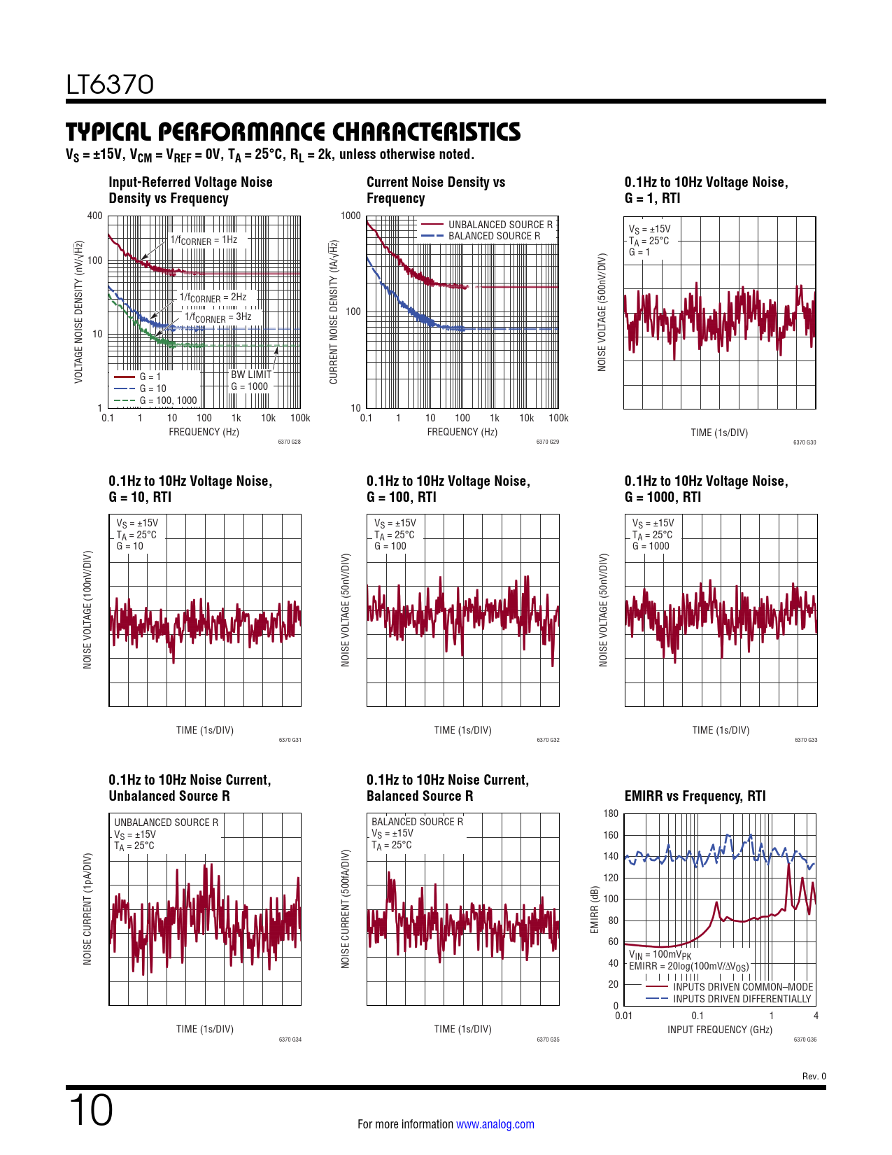 LT6370 TYPICAL PERFORMANCE CHARACTERISTICSVS = ±15V, VCM = VREF = 0V, TA = 25°C, RL = 2k, unless otherwise noted.Input-Referred Voltage NoiseCurrent Noise Density vs0.1Hz to 10Hz Voltage Noise,Density vs FrequencyFrequencyG = 1, RTI 400 1000 UNBALANCED SOURCE R VS = ±15V ) 1/f BALANCED SOURCE R CORNER = 1Hz ) TA = 25°C Hz Hz /√ G = 1 100 /DIV) Y (nV Y (fA/√ 1/fCORNER = 2Hz 1/f 100 CORNER = 3Hz TAGE (500nV 10 TAGE NOISE DENSIT NOISE VOL G = 1 BW LIMIT VOL CURRENT NOISE DENSIT G = 10 G = 1000 G = 100, 1000 1 10 0.1 1 10 100 1k 10k 100k 0.1 1 10 100 1k 10k 100k FREQUENCY (Hz) FREQUENCY (Hz) TIME (1s/DIV) 6370 G28 6370 G29 6370 G30 0.1Hz to 10Hz Voltage Noise,0.1Hz to 10Hz Voltage Noise,0.1Hz to 10Hz Voltage Noise,G = 10, RTIG = 100, RTIG = 1000, RTI VS = ±15V VS = ±15V VS = ±15V TA = 25°C TA = 25°C TA = 25°C G = 10 G = 100 G = 1000 /DIV) /DIV) /DIV) TAGE (100nV TAGE (50nV TAGE (50nV NOISE VOL NOISE VOL NOISE VOL TIME (1s/DIV) TIME (1s/DIV) TIME (1s/DIV) 6370 G31 6370 G32 6370 G33 0.1Hz to 10Hz Noise Current,0.1Hz to 10Hz Noise Current,Unbalanced Source RBalanced Source REMIRR vs Frequency, RTI 180 UNBALANCED SOURCE R BALANCED SOURCE R VS = ±15V VS = ±15V 160 TA = 25°C TA = 25°C 140 120 100 80 EMIRR (dB) 60 V NOISE CURRENT (1pA/DIV) IN = 100mVPK NOISE CURRENT (500fA/DIV) 40 EMIRR = 20log(100mV/∆VOS) 20 INPUTS DRIVEN COMMON–MODE INPUTS DRIVEN DIFFERENTIALLY 00.01 0.1 1 4 TIME (1s/DIV) TIME (1s/DIV) INPUT FREQUENCY (GHz) 6370 G34 6370 G35 6370 G36 Rev. 0 10 For more information www.analog.com Document Outline Features Applications Typical Application Description Absolute Maximum Ratings Pin Configuration Order Information Electrical Characteristics Typical Performance Characteristics Pin Functions Simplified Block Diagram Theory of Operation Applications Information Typical Applications Package Description Typical Application Related Parts