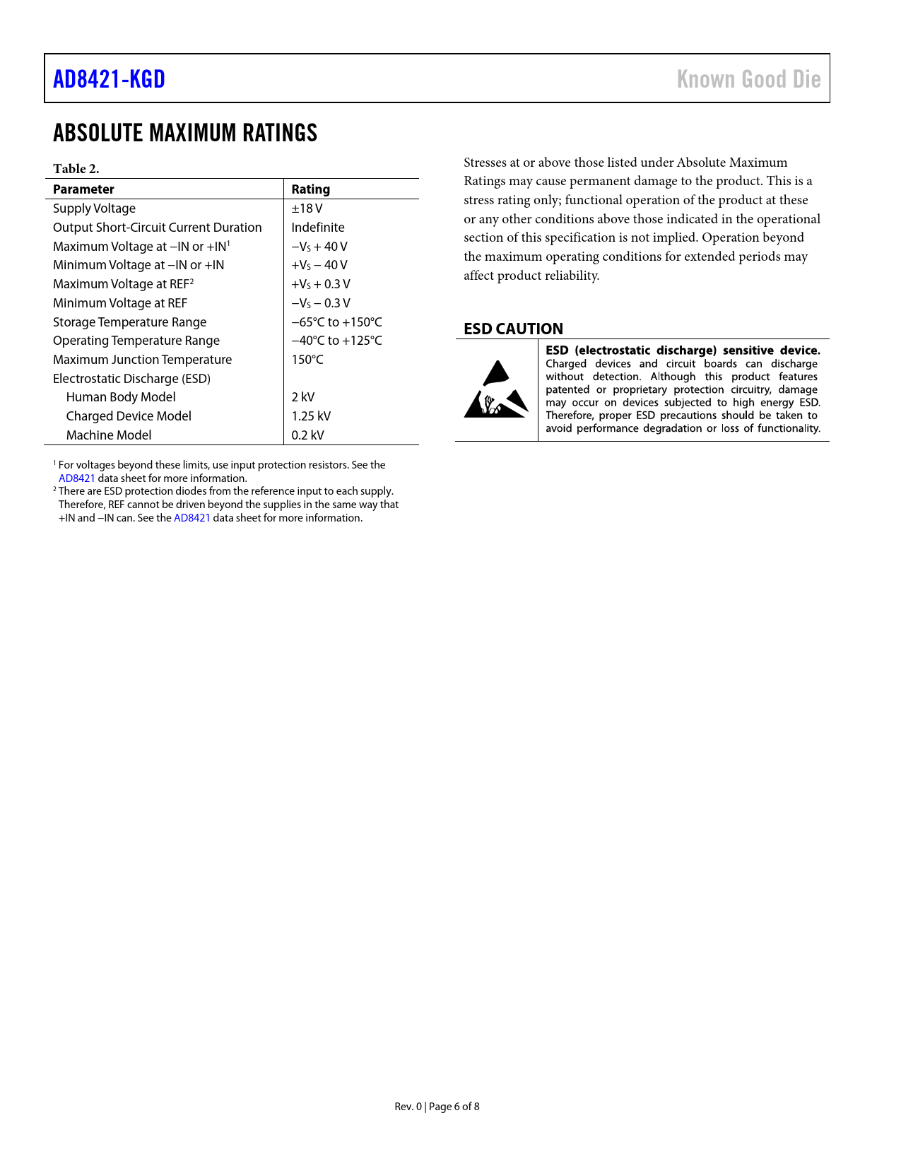 AD8421-KGD Known Good Die ABSOLUTE MAXIMUM RATINGS Table 2 Parameter Rating ESD CAUTION