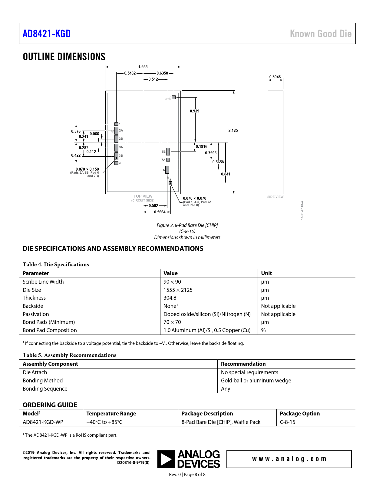 | 页数 / 页 | 8 / 8 — AD8421-KGD. Known Good Die. OUTLINE DIMENSIONS. 1.555. 0.5482. 0.6358. … |