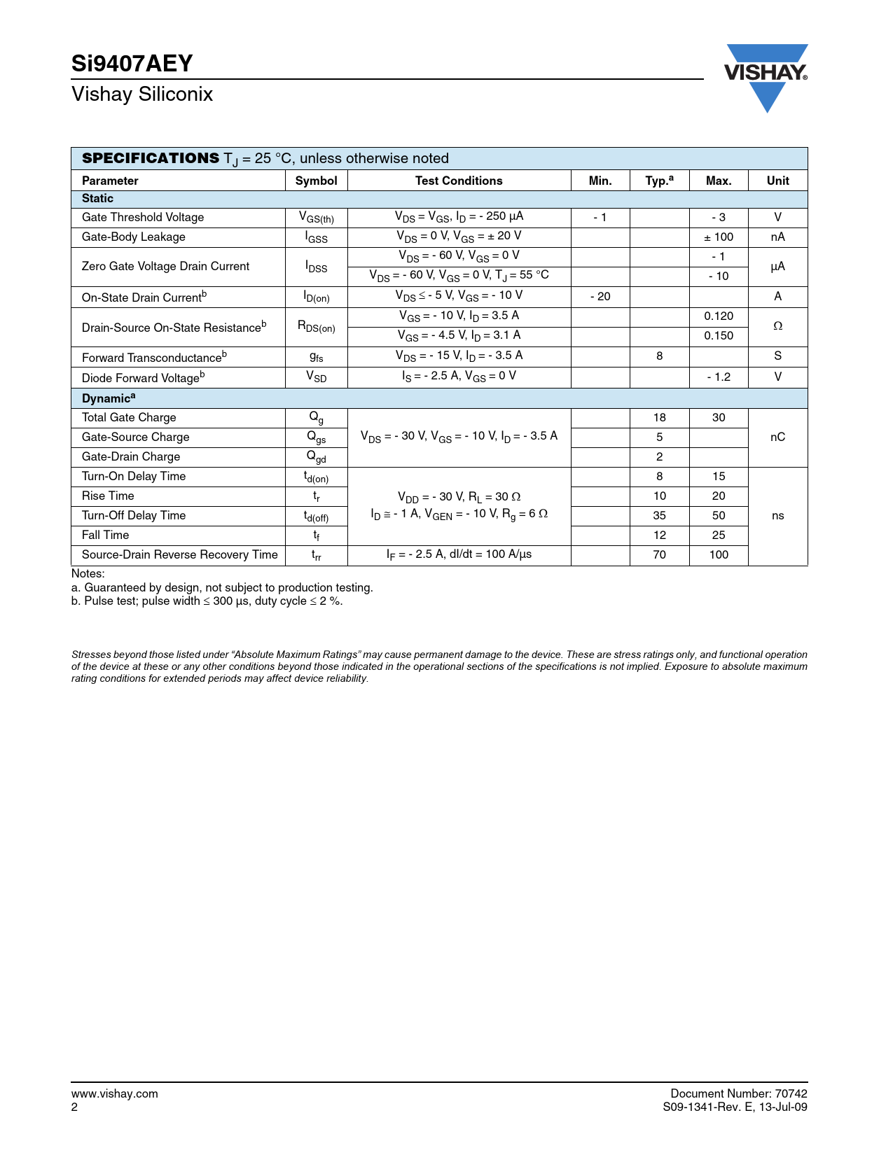 页数 / 页5 / 2 — Si9407AEY. SPECIFICATIONS. Parameter Symbol. Test. Conditions. Min. …