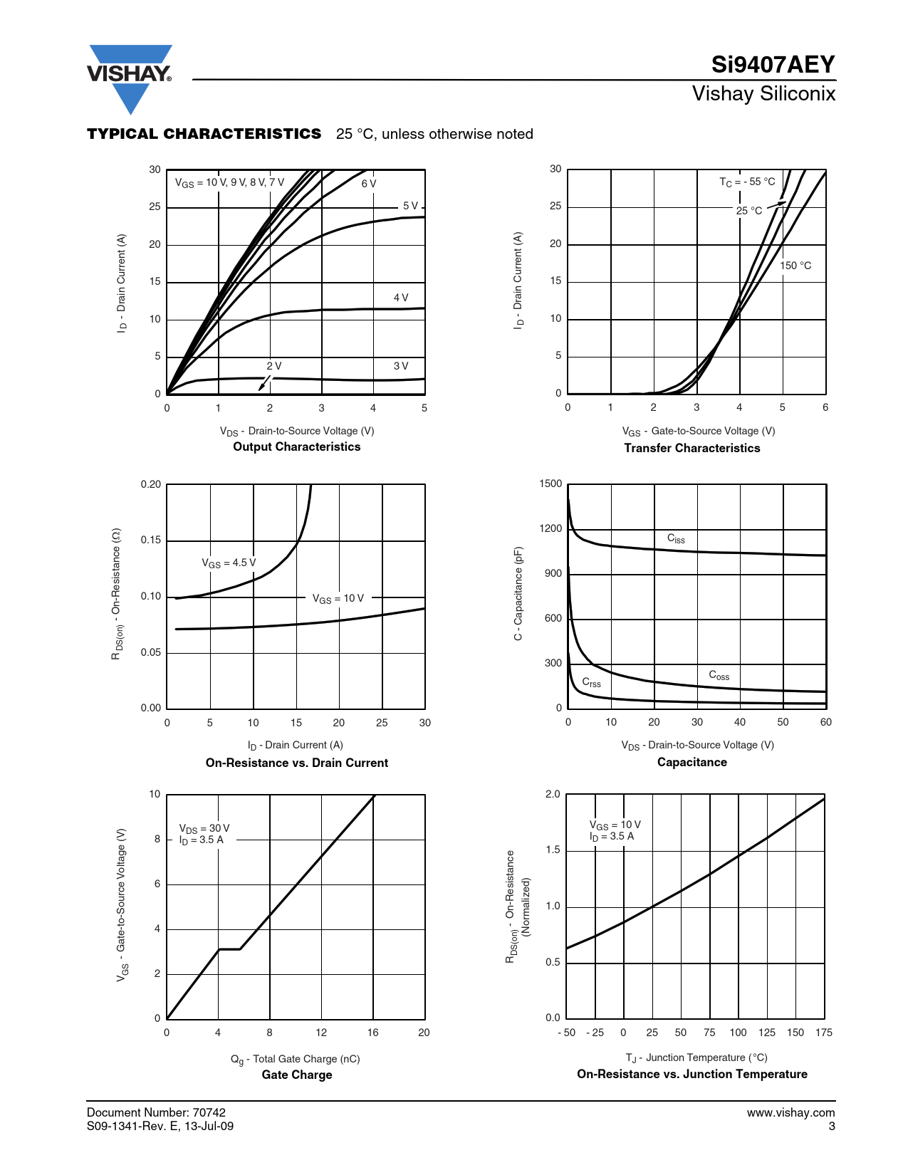 Si9407AEY Vishay Siliconix TYPICAL CHARACTERISTICS 25 °C, unless otherwise noted 30 30 VGS = 10 V, 9 V, 8 V, 7 V 6 V TC = - 55 °C 25 5 V 25 25 °C 20 20 150 °C 15 15 ain Current (A) 4 V ain Current (A) - Dr - Dr 10 10 I D I D 5 5 2 V 3 V 0 0 0 1 2 3 4 5 0 1 2 3 4 5 6 VDS - Drain-to-Source Voltage (V) VGS - Gate-to-Source Voltage (V) Output CharacteristicsTransfer Characteristics 0.20 1500 ) Ω 1200 ( 0.15 Ciss VGS = 4.5 V 900 esistance -R 0.10 VGS = 10 V - On 600 - Capacitance (pF) C DS(on) 0.05 R 300 C C oss rss 0.00 0 0 5 10 15 20 25 30 0 10 20 30 40 50 60 ID - Drain Current (A) VDS - Drain-to-Source Voltage (V) On-Resistance vs. Drain CurrentCapacitance 10 2.0 V V DS = 30 V GS = 10 V 8 I I D = 3.5 A D = 3.5 A 1.5 oltage (V) V 6 ed) 1.0 maliz - On-Resistance 4 (Nor (on) - Gate-to-Source DSR 0.5 GS 2 V 0 0.0 0 4 8 12 16 20 - 50 - 25 0 25 50 75 100 125 150 175 Q T g - Total Gate Charge (nC) J - Junction Temperature ( °C) Gate ChargeOn-Resistance vs. Junction Temperature Document Number: 70742 www.vishay.com S09-1341-Rev. E, 13-Jul-09 3