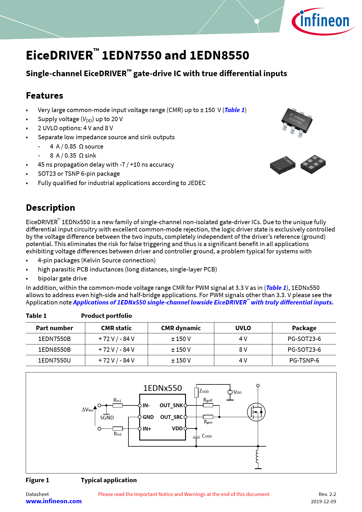 EiceDRIVER™ 1EDN7550 and 1EDN8550 Single-channel EiceDRIVER™ gate-drive IC with true differential inputs. Features. Table 1