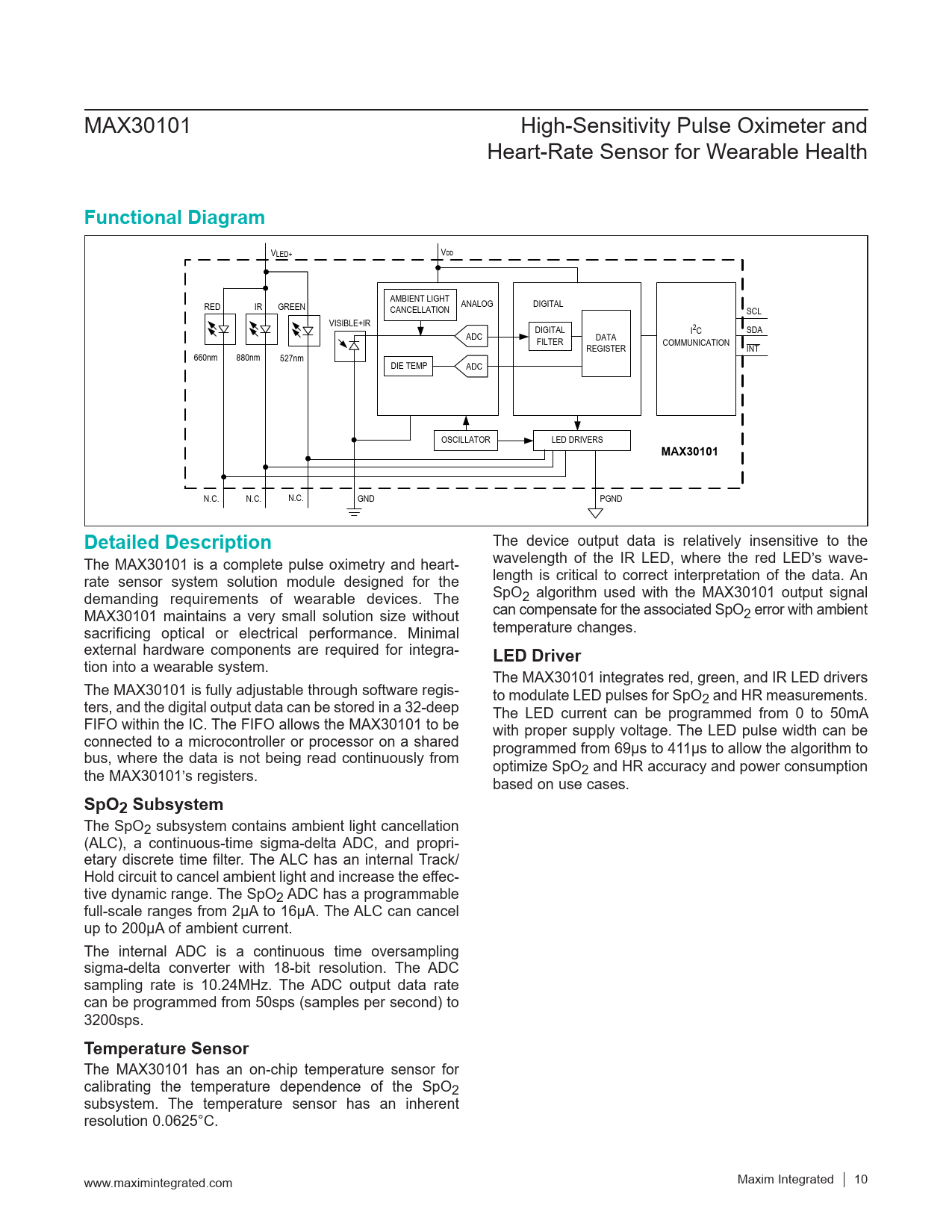 MAX30101 High-Sensitivity Pulse Oximeter and Heart-Rate Sensor for Wearable Health Functional Diagram VLED+ VDD AMBIENT LIGHT RED IR GREEN CANCELLATION ANALOG DIGITAL SCL VISIBLE+IR SDA ADC DIGITAL I2C FILTER DATA REGISTER COMMUNICATION INT 660nm 880nm 527nm DIE TEMP ADC OSCILLATOR LED DRIVERS MAX30101 N.C. N.C. N.C. GND PGND Detailed Description The device output data is relatively insensitive to the The MAX30101 is a complete pulse oximetry and heart- wavelength of the IR LED, where the red LED’s wave- rate sensor system solution module designed for the length is critical to correct interpretation of the data. An demanding requirements of wearable devices. The SpO2 algorithm used with the MAX30101 output signal MAX30101 maintains a very small solution size without can compensate for the associated SpO2 error with ambient sacrificing optical or electrical performance. Minimal temperature changes. external hardware components are required for integra- LED Driver tion into a wearable system. The MAX30101 integrates red, green, and IR LED drivers The MAX30101 is fully adjustable through software regis- to modulate LED pulses for SpO ters, and the digital output data can be stored in a 32-deep 2 and HR measurements. The LED current can be programmed from 0 to 50mA FIFO within the IC. The FIFO allows the MAX30101 to be with proper supply voltage. The LED pulse width can be connected to a microcontroller or processor on a shared bus, where the data is not being read continuously from programmed from 69µs to 411µs to allow the algorithm to optimize SpO the MAX30101’s registers. 2 and HR accuracy and power consumption based on use cases. SpO2 Subsystem The SpO2 subsystem contains ambient light cancellation (ALC), a continuous-time sigma-delta ADC, and propri- etary discrete time filter. The ALC has an internal Track/ Hold circuit to cancel ambient light and increase the effec- tive dynamic range. The SpO2 ADC has a programmable full-scale ranges from 2µA to 16µA. The ALC can cancel up to 200µA of ambient current. The internal ADC is a continuous time oversampling sigma-delta converter with 18-bit resolution. The ADC sampling rate is 10.24MHz. The ADC output data rate can be programmed from 50sps (samples per second) to 3200sps. Temperature Sensor The MAX30101 has an on-chip temperature sensor for calibrating the temperature dependence of the SpO2 subsystem. The temperature sensor has an inherent resolution 0.0625°C. www.maximintegrated.com Maxim Integrated │ 10