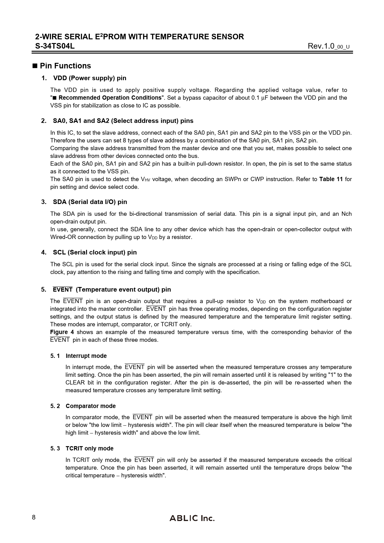 页数 / 页38 / 8 — 2-WIRE SERIAL E2PROM WITH TEMPERATURE SENSOR S-34TS04L. Pin Functions. 1. …