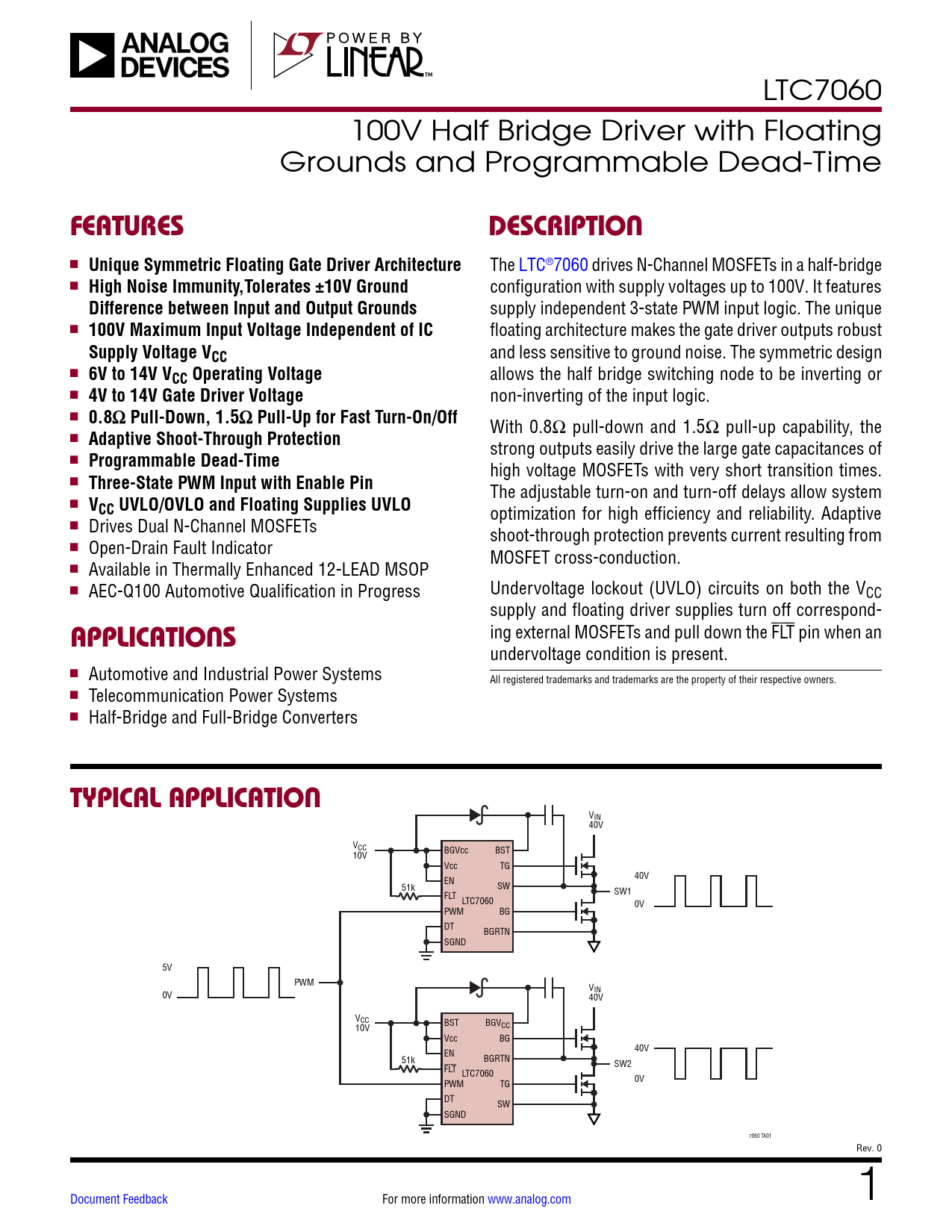 LTC7060 100V Half Bridge Driver with Floating Grounds and Programmable Dead-Time FEATURESDESCRIPTION n Unique Symmetric Floating Gate Driver Architecture The LTC®7060 drives N-Channel MOSFETs in a half-bridge n High Noise Immunity,Tolerates ±10V Ground configuration with supply voltages up to 100V. It features Difference between Input and Output Grounds supply independent 3-state PWM input logic. The unique n 100V Maximum Input Voltage Independent of IC floating architecture makes the gate driver outputs robust Supply Voltage VCC and less sensitive to ground noise. The symmetric design n 6V to 14V VCC Operating Voltage allows the half bridge switching node to be inverting or n 4V to 14V Gate Driver Voltage non-inverting of the input logic. n 0.8Ω Pull-Down, 1.5Ω Pull-Up for Fast Turn-On/Off With 0.8Ω pull-down and 1.5Ω pull-up capability, the n Adaptive Shoot-Through Protection strong outputs easily drive the large gate capacitances of n Programmable Dead-Time high voltage MOSFETs with very short transition times. n Three-State PWM Input with Enable Pin The adjustable turn-on and turn-off delays allow system n VCC UVLO/OVLO and Floating Supplies UVLO optimization for high efficiency and reliability. Adaptive n Drives Dual N-Channel MOSFETs shoot-through protection prevents current resulting from n Open-Drain Fault Indicator MOSFET cross-conduction. n Available in Thermally Enhanced 12-LEAD MSOP n AEC-Q100 Automotive Qualification in Progress Undervoltage lockout (UVLO) circuits on both the VCC supply and floating driver supplies turn off correspond- ing external MOSFETs and pull down the FLT pin when an APPLICATIONS undervoltage condition is present. n Automotive and Industrial Power Systems All registered trademarks and trademarks are the property of their respective owners. n Telecommunication Power Systems n Half-Bridge and Full-Bridge Converters TYPICAL APPLICATION VIN 40V VCC BGVcc BST 10V Vcc TG EN 40V 51k SW FLT SW1 LTC7060 0V PWM BG DT BGRTN SGND 5V PWM VIN 0V 40V VCC BST BGVCC 10V Vcc BG EN 40V 51k BGRTN FLT SW2 LTC7060 PWM TG 0V DT SW SGND 7060 TA01 Rev. 0 Document Feedback For more information www.analog.com 1 Document Outline Features Applications Typical Application Description Absolute Maximum Ratings Order Information Pin Configuration Electrical Characteristics Typical Performance Characteristics Pin Functions Block Diagram Timing Diagram Operation Applications InformatioN Typical Applications Package Description Typical Application Related Parts
