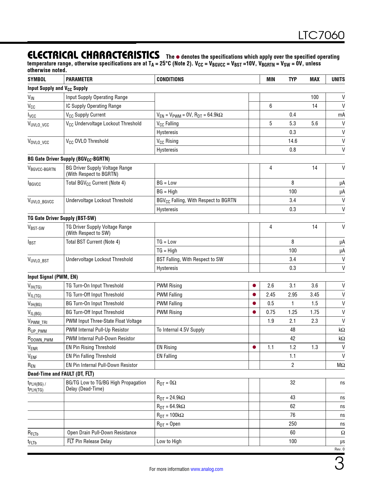 tPLH(BG) / BG/TG Low to TG/BG High Propagation RDT = 0Ω 32 ns tPLH(TG) Delay (Dead-Time) RDT = 24.9kΩ 43 ns RDT = 64.9kΩ 62 ns RDT = 100kΩ 76 ns RDT = Open 250 ns RFLTb Open Drain Pull-Down Resistance 60 Ω tFLTb FLT Pin Release Delay Low to High 100 µs Rev. 0 For more information www.analog.com 3 Document Outline Features Applications Typical Application Description Absolute Maximum Ratings Order Information Pin Configuration Electrical Characteristics Typical Performance Characteristics Pin Functions Block Diagram Timing Diagram Operation Applications InformatioN Typical Applications Package Description Typical Application Related Parts