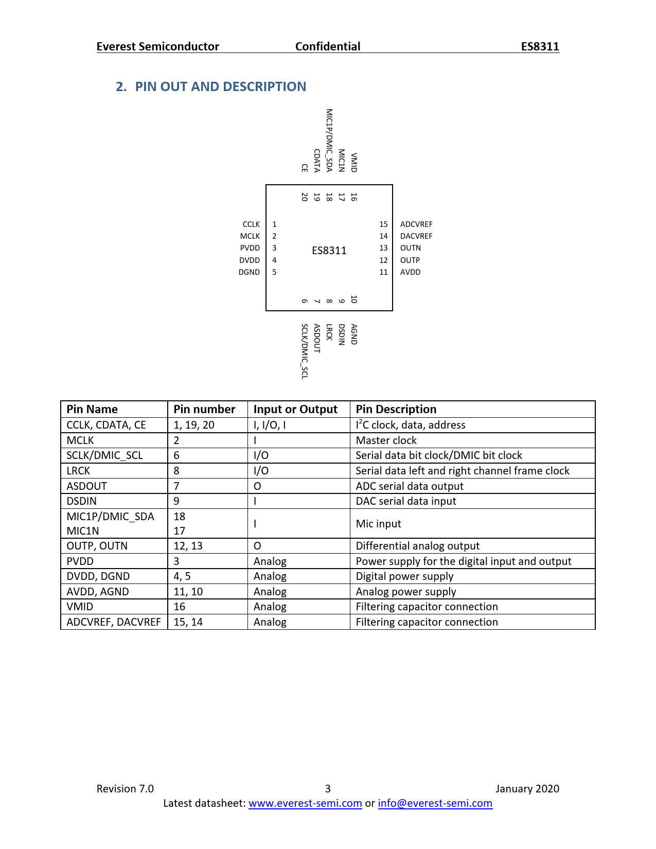 Everest SemiconductorConfidentialES83112. PIN OUT AND DESCRIPTION M IC1 P/DM CD IC_ M VM I A S C CE T DA 1N I A D 20 19 18 17 16 CCLK 1 15 ADCVREF MCLK 2 14 DACVREF PVDD 3 ES8311 13 OUTN DVDD 4 12 OUTP DGND 5 11 AVDD 10 6 7 8 9 S ASD LR DS A CLK GND CK DI OU / N D M T IC_ SCL Pin NamePin number Input or Output Pin Description CCLK, CDATA, CE 1, 19, 20 I, I/O, I I2C clock, data, address MCLK 2 I Master clock SCLK/DMIC_SCL 6 I/O Serial data bit clock/DMIC bit clock LRCK 8 I/O Serial data left and right channel frame clock ASDOUT 7 O ADC serial data output DSDIN 9 I DAC serial data input MIC1P/DMIC_SDA 18 MIC1N 17 I Mic input OUTP, OUTN 12, 13 O Differential analog output PVDD 3 Analog Power supply for the digital input and output DVDD, DGND 4, 5 Analog Digital power supply AVDD, AGND 11, 10 Analog Analog power supply VMID 16 Analog Filtering capacitor connection ADCVREF, DACVREF 15, 14 Analog Filtering capacitor connection Revision 7.0 3 January 2020 Latest datasheet: www.everest-semi.com or info@everest-semi.com Document Outline Block Diagram Pin Out and Description typical APPLICATION CIRCUIT Clock Modes and Sampling Frequencies Micro-controller configuration Interface Digital Audio Interface ELECTRICAL CHARACTERISTICS Absolute Maximum Ratings Recommended Operating Conditions ADC Analog and Filter Characteristics and Specifications DAC Analog and Filter Characteristics and Specifications DC Characteristics Serial Audio Port Switching Specifications I2C Switching Specifications (slow speed mode/high speed mode) Package CORPORATe INFORMATION