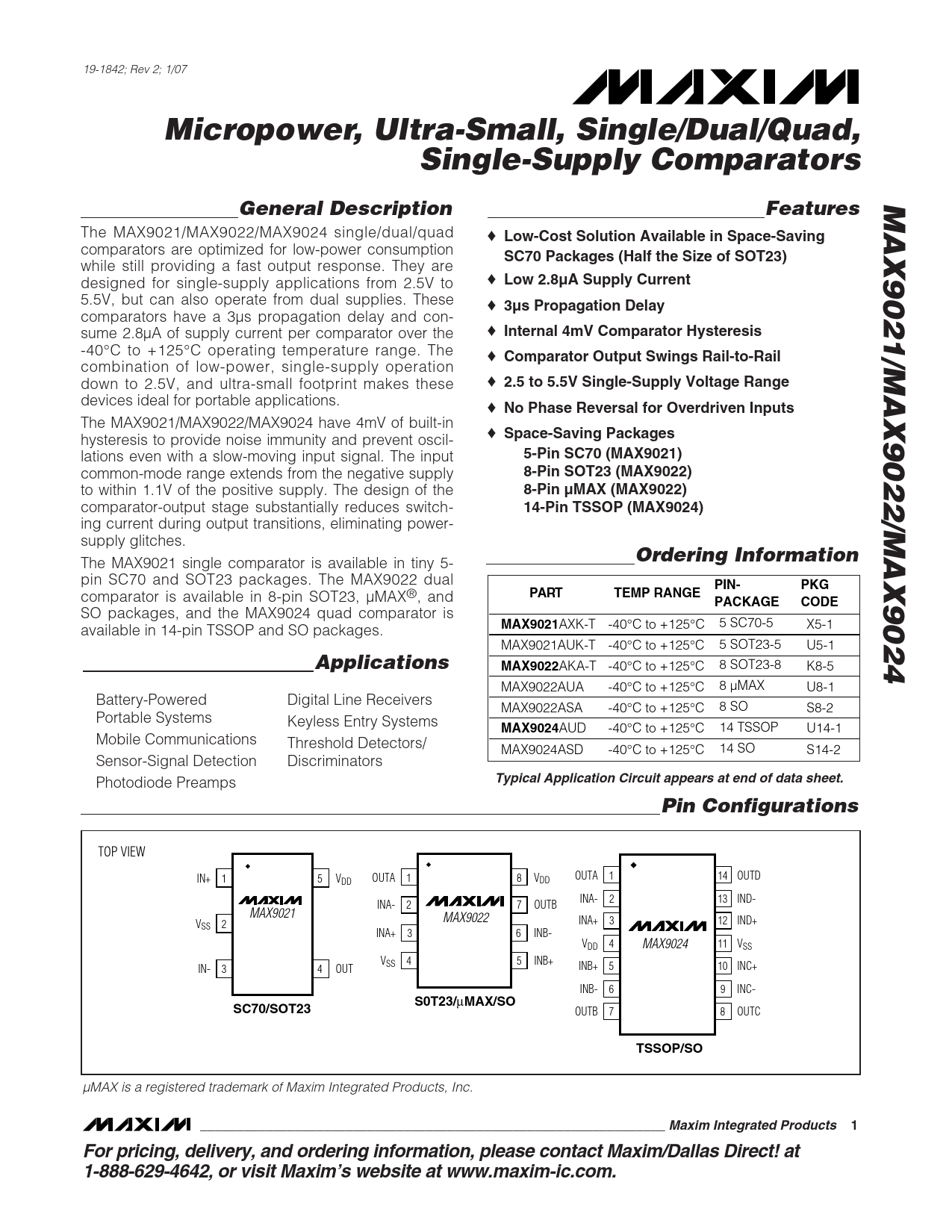 19-1842; Rev 2; 1/07 Micropower, Ultra-Small, Single/Dual/Quad,Single-Supply ComparatorsMAX9021/MAX9022/MAX9024General DescriptionFeatures The MAX9021/MAX9022/MAX9024 single/dual/quad ♦ Low-Cost Solution Available in Space-Saving comparators are optimized for low-power consumption SC70 Packages (Half the Size of SOT23) while still providing a fast output response. They are designed for single-supply applications from 2.5V to ♦ Low 2.8µA Supply Current 5.5V, but can also operate from dual supplies. These ♦ 3µs Propagation Delay comparators have a 3µs propagation delay and con- sume 2.8µA of supply current per comparator over the ♦ Internal 4mV Comparator Hysteresis -40°C to +125°C operating temperature range. The ♦ Comparator Output Swings Rail-to-Rail combination of low-power, single-supply operation down to 2.5V, and ultra-small footprint makes these ♦ 2.5 to 5.5V Single-Supply Voltage Range devices ideal for portable applications. ♦ No Phase Reversal for Overdriven Inputs The MAX9021/MAX9022/MAX9024 have 4mV of built-in ♦ hysteresis to provide noise immunity and prevent oscil- Space-Saving Packages lations even with a slow-moving input signal. The input 5-Pin SC70 (MAX9021) common-mode range extends from the negative supply 8-Pin SOT23 (MAX9022) to within 1.1V of the positive supply. The design of the 8-Pin µMAX (MAX9022) comparator-output stage substantially reduces switch- 14-Pin TSSOP (MAX9024) ing current during output transitions, eliminating power- supply glitches. Ordering Information The MAX9021 single comparator is available in tiny 5- pin SC70 and SOT23 packages. The MAX9022 dual PIN-PKG comparator is available in 8-pin SOT23, µMAX®, and PA RTTEMP RANGEPACKAGECODE SO packages, and the MAX9024 quad comparator is available in 14-pin TSSOP and SO packages. MAX9021 AXK-T -40°C to +125°C 5 SC70-5 X5-1 MAX9021AUK-T -40°C to +125°C 5 SOT23-5 U5-1 ApplicationsMAX9022 AKA-T -40°C to +125°C 8 SOT23-8 K8-5 MAX9022AUA -40°C to +125°C 8 µMAX U8-1 Battery-Powered Digital Line Receivers MAX9022ASA -40°C to +125°C 8 SO S8-2 Portable Systems Keyless Entry Systems MAX9024 AUD -40°C to +125°C 14 TSSOP U14-1 Mobile Communications Threshold Detectors/ MAX9024ASD -40°C to +125°C 14 SO S14-2 Sensor-Signal Detection Discriminators Photodiode Preamps Typical Application Circuit appears at end of data sheet.Pin Configurations TOP VIEW IN+ 1 5 V OUTA 1 14 OUTD DD OUTA 1 8 VDD INA- 2 13 IND- INA- 2 7 OUTB MAX9021 MAX9022 V INA+ 3 12 IND+ SS 2 INA+ 3 6 INB- VDD 4 MAX9024 11 VSS VSS 4 5 INB+ IN- 3 4 OUT INB+ 5 10 INC+ INB- 6 9 INC- S0T23/ µ MAX/SOSC70/SOT23 OUTB 7 8 OUTC TSSOP/SO µMAX is a registered trademark of Maxim Integrated Products, Inc. ________________________________________________________________ Maxim Integrated Products1For pricing, delivery, and ordering information, please contact Maxim/Dallas Direct! at 1-888-629-4642, or visit Maxim’s website at www.maxim-ic.com.