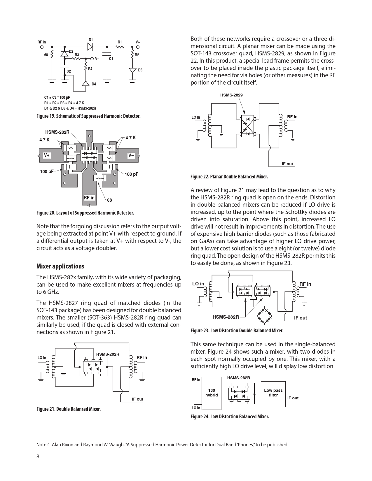 Both of these networks require a crossover or a three di‑ RF inD1R1V+ mensional circuit. A planar mixer can be made using the D268R3R2 SOT‑143 crossover quad, HSMS‑2829, as shown in Figure V–C1 22. In this product, a special lead frame permits the cross‑ R4D3 over to be placed inside the plastic package itself, elimi‑ C2 nating the need for via holes (or other measures) in the RF D4 portion of the circuit itself. C1 = C2 ª 100 pFHSMS-2829R1 = R2 = R3 = R4 = 4.7 K D1 & D2 & D3 & D4 = HSMS-282RFigure 19. Schematic of Suppressed Harmonic Detector.LO inRF inHSMS-282R4.7 K4.7 KV+V–IF out100 pF100 pFFigure 22. Planar Double Balanced Mixer. A review of Figure 21 may lead to the question as to why RF in68 the HSMS‑282R ring quad is open on the ends. Distortion in double balanced mixers can be reduced if LO drive is Figure 20. Layout of Suppressed Harmonic Detector. increased, up to the point where the Schottky diodes are driven into saturation. Above this point, increased LO Note that the forgoing discussion refers to the output volt‑ drive will not result in improvements in distortion. The use age being extracted at point V+ with respect to ground. If of expensive high barrier diodes (such as those fabricated a differential output is taken at V+ with respect to V‑, the on GaAs) can take advantage of higher LO drive power, circuit acts as a voltage doubler. but a lower cost solution is to use a eight (or twelve) diode ring quad. The open design of the HSMS‑282R permits this Mixer applications to easily be done, as shown in Figure 23. The HSMS‑282x family, with its wide variety of packaging, can be used to make excellent mixers at frequencies up LO inRF in to 6 GHz. The HSMS‑2827 ring quad of matched diodes (in the SOT‑143 package) has been designed for double balanced mixers. The smaller (SOT‑363) HSMS‑282R ring quad can HSMS-282RIF out similarly be used, if the quad is closed with external con‑ nections as shown in Figure 21. Figure 23. Low Distortion Double Balanced Mixer. This same technique can be used in the single‑balanced HSMS-282R mixer. Figure 24 shows such a mixer, with two diodes in LO inRF in each spot normally occupied by one. This mixer, with a sufficiently high LO drive level, will display low distortion. HSMS-282RRF in180Low passhybridfilterIF outIF outFigure 21. Double Balanced Mixer.LO inFigure 24. Low Distortion Balanced Mixer. Note 4. Alan Rixon and Raymond W. Waugh, “A Suppressed Harmonic Power Detector for Dual Band ‘Phones,” to be published. 8