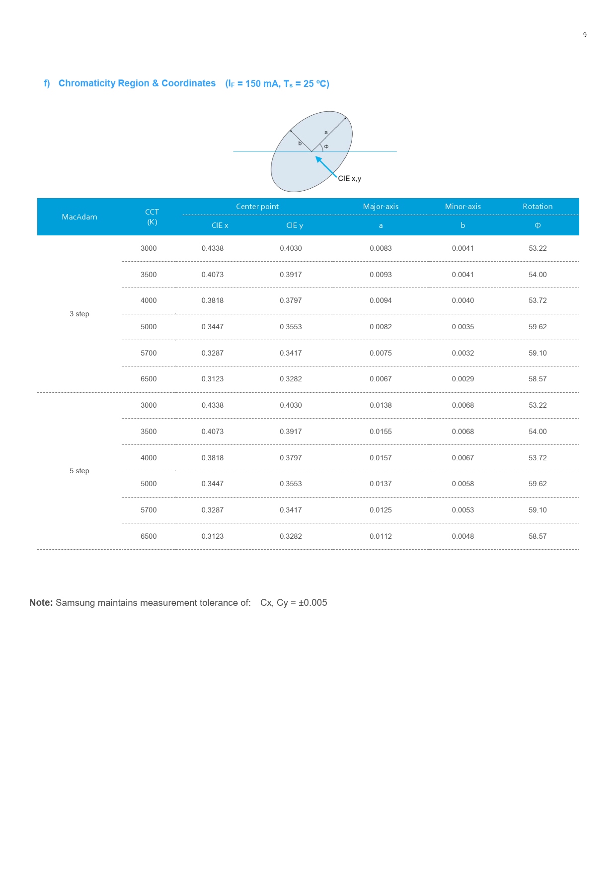 f) Chromaticity Region & Coordinates (IF = 150 mA, Ts = 25 ºC). Note: