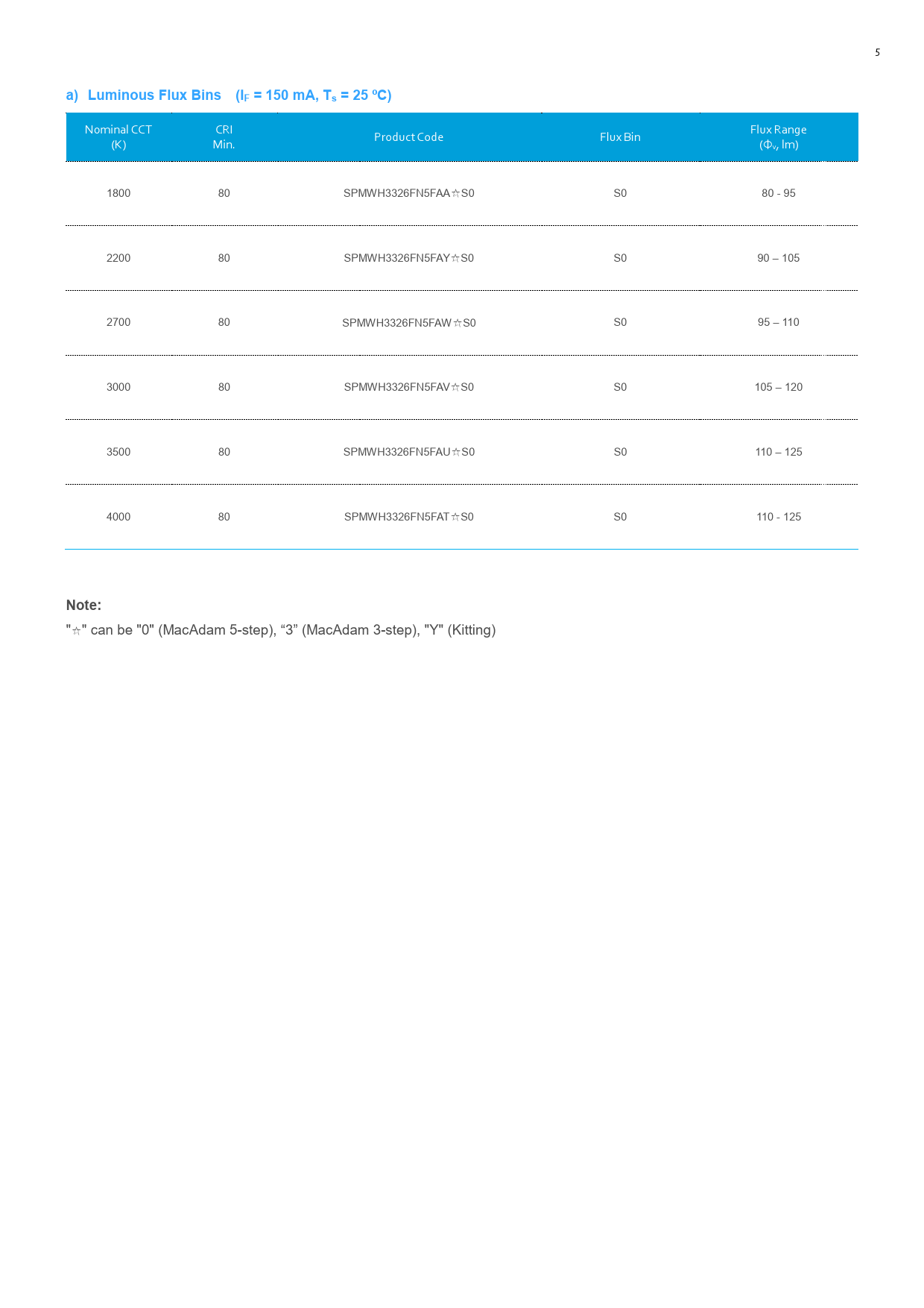 Nominal CCT CRI Flux Range Product Code Flux Bin (K) Min. (Φv, lm) 1800 80 SPMWH3326FN5FAA☆S0 S0 80 - 95 2200 80 SPMWH3326FN5FAY☆S0 S0 90 – 105 2700 80 SPMWH3326FN5FAW☆S0 S0 95 – 110 3000 80 SPMWH3326FN5FAV☆S0 S0 105 – 120 3500 80 SPMWH3326FN5FAU☆S0 S0 110 – 125 4000 80 SPMWH3326FN5FAT☆S0 S0 110 - 125