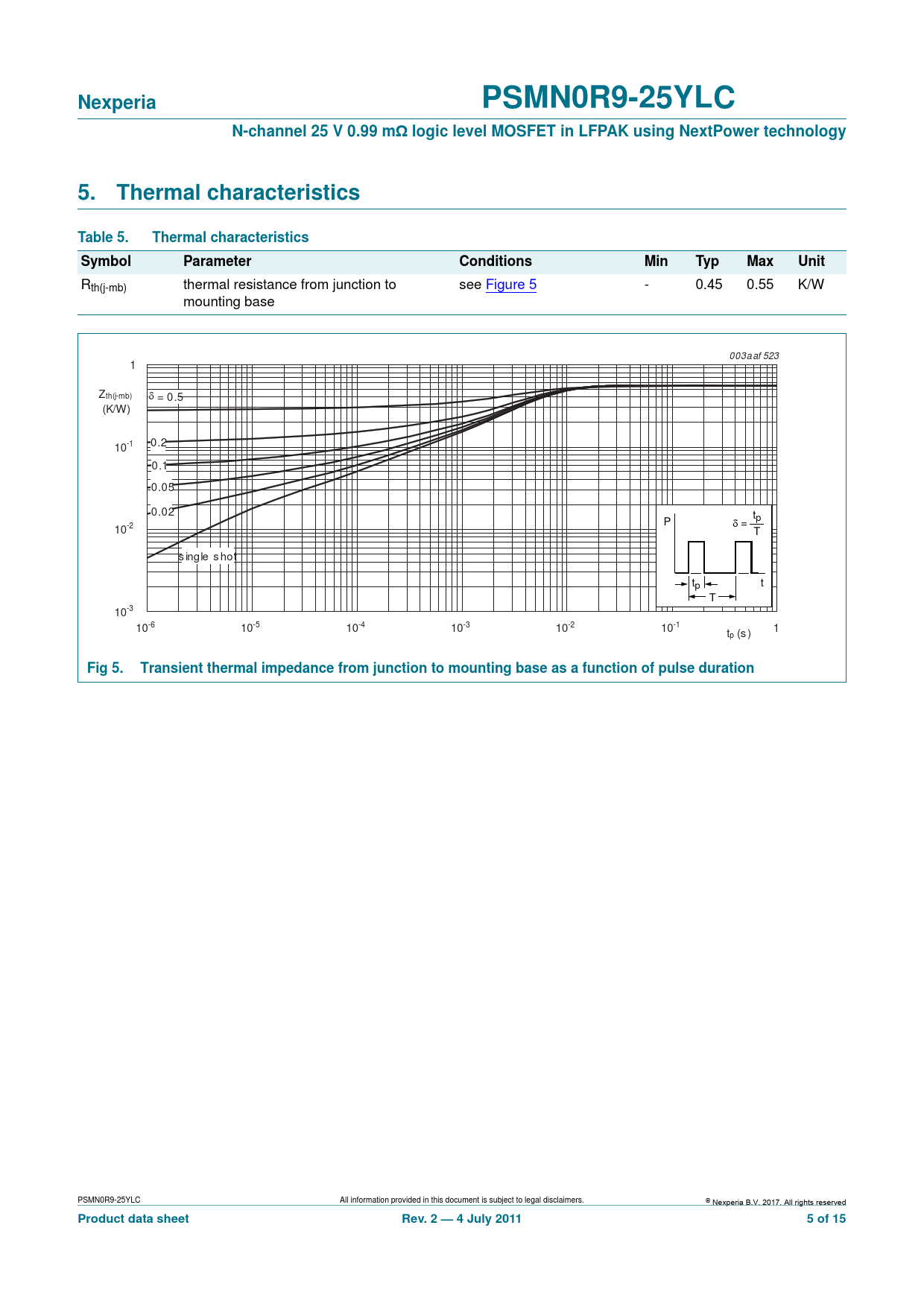 Nexperia PSMN0R9-25YLC N-channel 25 V 0.99 mΩ logic level MOSFET in LFPAK using NextPower technology 5. Thermal characteristics Table 5. Thermal characteristics Symbol Parameter Conditions Min Typ Max Unit