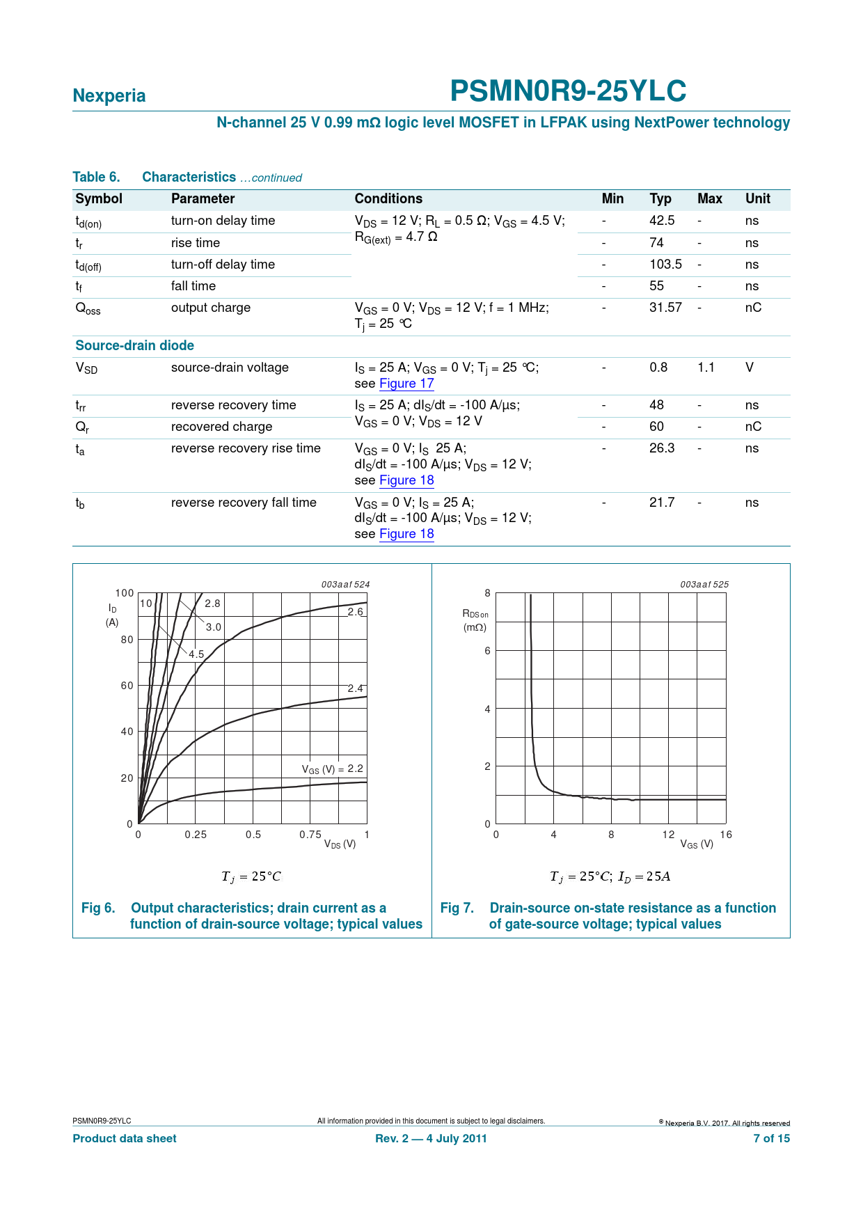 Nexperia PSMN0R9-25YLC N-channel 25 V 0.99 mΩ logic level MOSFET in LFPAK using NextPower technology Table 6. Characteristics