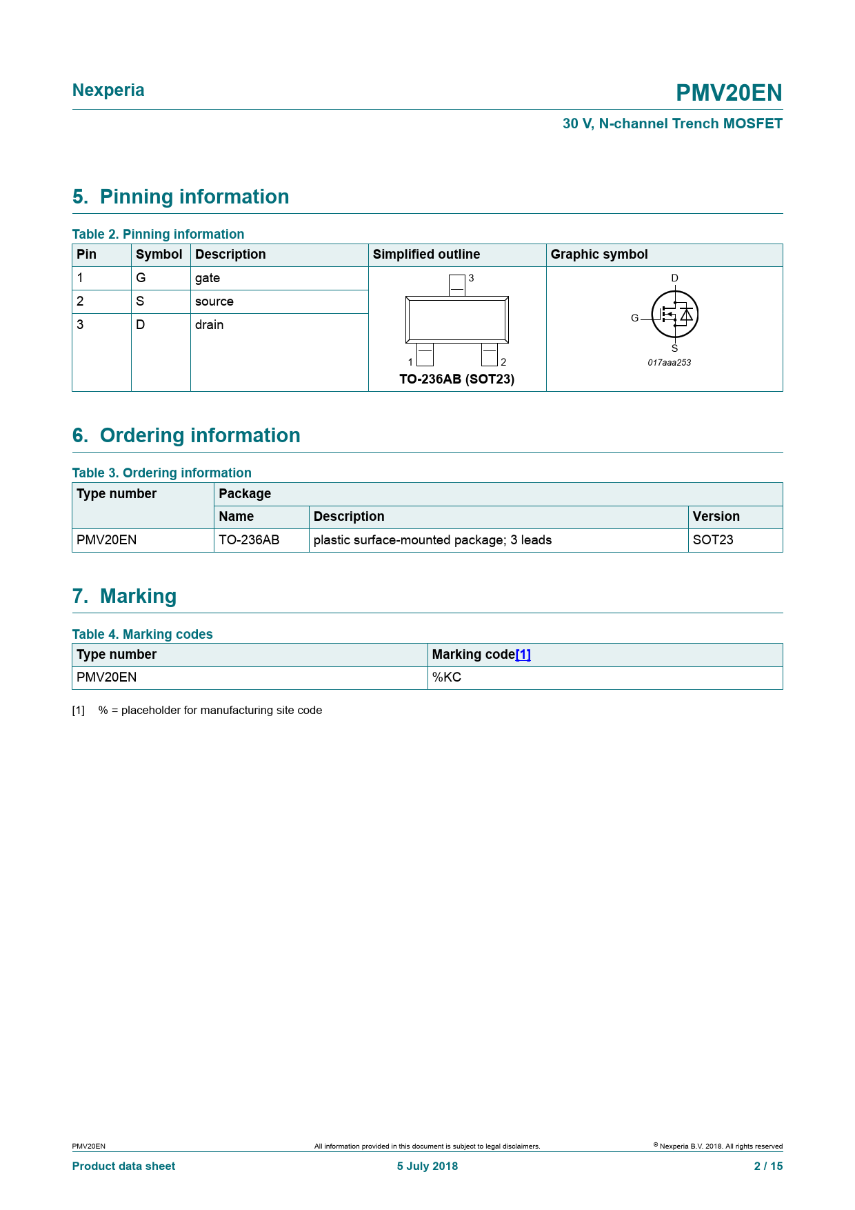 | 页数 / 页 | 15 / 2 — Nexperia. PMV20EN. 30 V, N-channel Trench MOSFET. 5. Pinning information. … |