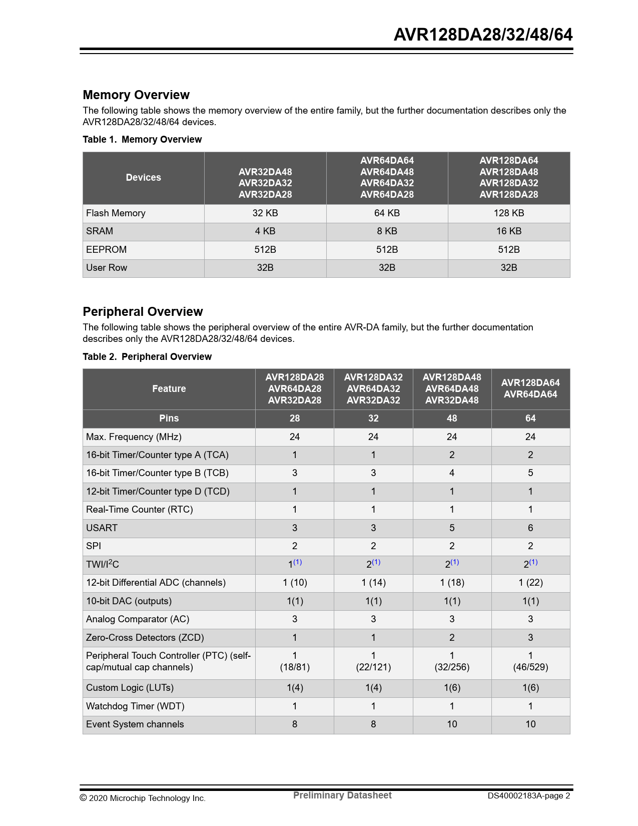 AVR128DA28/32/48/64. Memory Overview. Table 1. Memory Overview. AVR64DA64. AVR128DA64. AVR32DA48. AVR64DA48. AVR128DA48. Devices