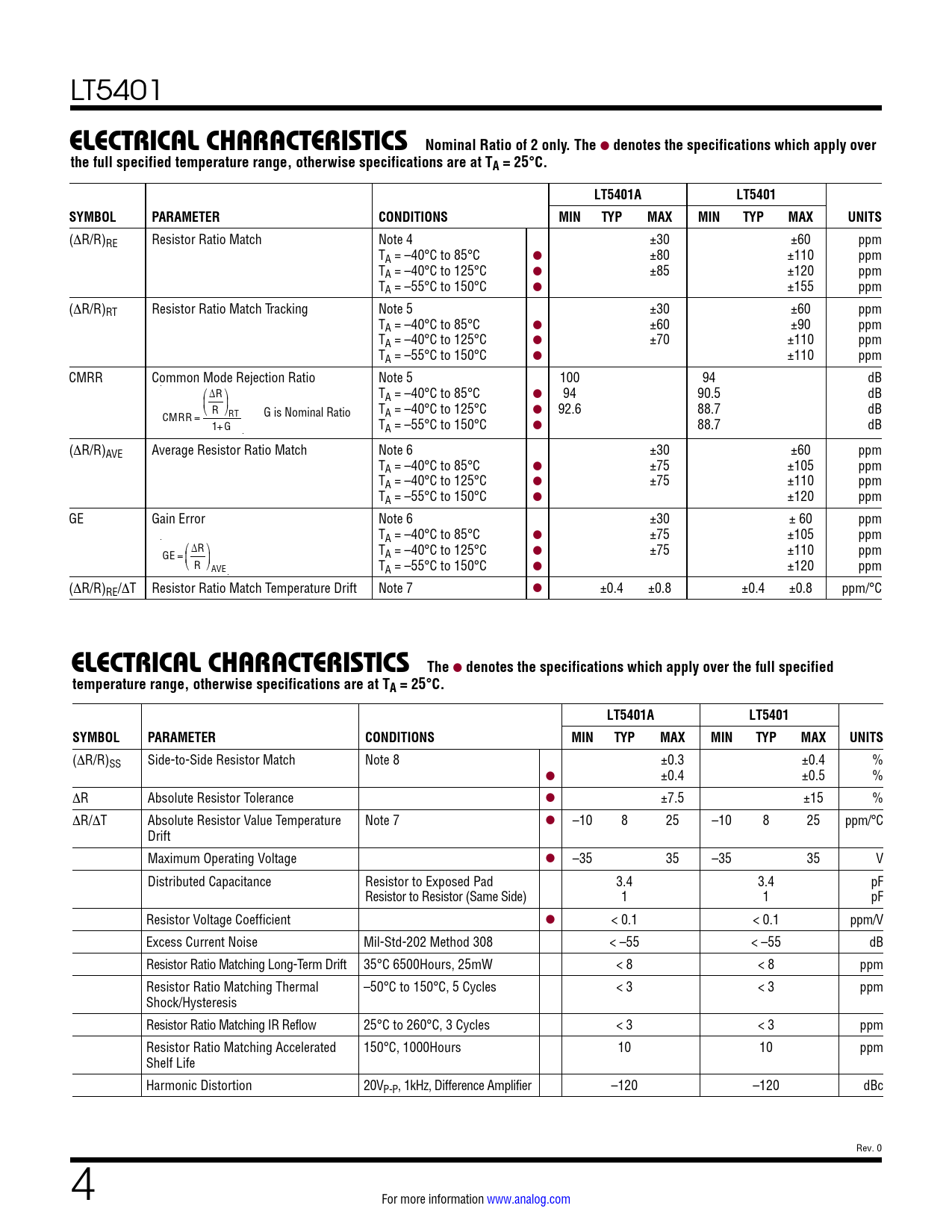 LT5401 ELECTRICAL CHARACTERISTICSNominal Ratio of 2 only. The l denotes the specifications which apply overthe full specified temperature range, otherwise specifications are at TA = 25°C.LT5401ALT5401SYMBOLPARAMETERCONDITIONSMINTYPMAXMINTYPMAXUNITS (∆R/R)RE Resistor Ratio Match Note 4 ±30 ±60 ppm TA = –40°C to 85°C l ±80 ±110 ppm TA = –40°C to 125°C l ±85 ±120 ppm TA = –55°C to 150°C l ±155 ppm (∆R/R)RT Resistor Ratio Match Tracking Note 5 ±30 ±60 ppm TA = –40°C to 85°C l ±60 ±90 ppm TA = –40°C to 125°C l ±70 ±110 ppm TA = –55°C to 150°C l ±110 ppm CMRR Common Mode Rejection Ratio Note 5 100 94 dB ⎛ ∆R ⎞ T l 94 90.5 dB ⎜ ⎟ A = –40°C to 85°C ⎝ R T l 92.6 88.7 dB CMRR ⎠ = RT G is Nominal Ratio A = –40°C to 125°C 1+G TA = –55°C to 150°C l 88.7 dB (∆R/R)AVE Average Resistor Ratio Match Note 6 ±30 ±60 ppm TA = –40°C to 85°C l ±75 ±105 ppm TA = –40°C to 125°C l ±75 ±110 ppm TA = –55°C to 150°C l ±120 ppm GE Gain Error Note 6 ±30 ± 60 ppm TA = –40°C to 85°C l ±75 ±105 ppm ⎛ ∆R ⎞ GE T ±75 ±110 ppm = l ⎜ ⎟ A = –40°C to 125°C ⎝ R ⎠AVE TA = –55°C to 150°C l ±120 ppm (∆R/R)RE/∆T Resistor Ratio Match Temperature Drift Note 7 l ±0.4 ±0.8 ±0.4 ±0.8 ppm/°C ELECTRICAL CHARACTERISTICSThe l denotes the specifications which apply over the full specifiedtemperature range, otherwise specifications are at TA = 25°C.LT5401ALT5401SYMBOLPARAMETERCONDITIONSMINTYPMAXMINTYPMAXUNITS (∆R/R)SS Side-to-Side Resistor Match Note 8 ±0.3 ±0.4 % l ±0.4 ±0.5 % ∆R Absolute Resistor Tolerance l ±7.5 ±15 % ∆R/∆T Absolute Resistor Value Temperature Note 7 l –10 8 25 –10 8 25 ppm/°C Drift Maximum Operating Voltage l –35 35 –35 35 V Distributed Capacitance Resistor to Exposed Pad 3.4 3.4 pF Resistor to Resistor (Same Side) 1 1 pF Resistor Voltage Coefficient l < 0.1 < 0.1 ppm/V Excess Current Noise Mil-Std-202 Method 308 < –55 < –55 dB Resistor Ratio Matching Long-Term Drift 35°C 6500Hours, 25mW < 8 < 8 ppm Resistor Ratio Matching Thermal –50°C to 150°C, 5 Cycles < 3 < 3 ppm Shock/Hysteresis Resistor Ratio Matching IR Reflow 25°C to 260°C, 3 Cycles < 3 < 3 ppm Resistor Ratio Matching Accelerated 150°C, 1000Hours 10 10 ppm Shelf Life Harmonic Distortion 20VP-P, 1kHz, Difference Amplifier –120 –120 dBc Rev. 0 4 For more information www.analog.com Document Outline Features Applications Typical Application Description Absolute Maximum Ratings Order Information Pin Configuration Electrical Characteristics Typical Performance Characteristics Pin Functions Block Diagram Applications Information Typical Applications Package Description Typical Application Related Parts