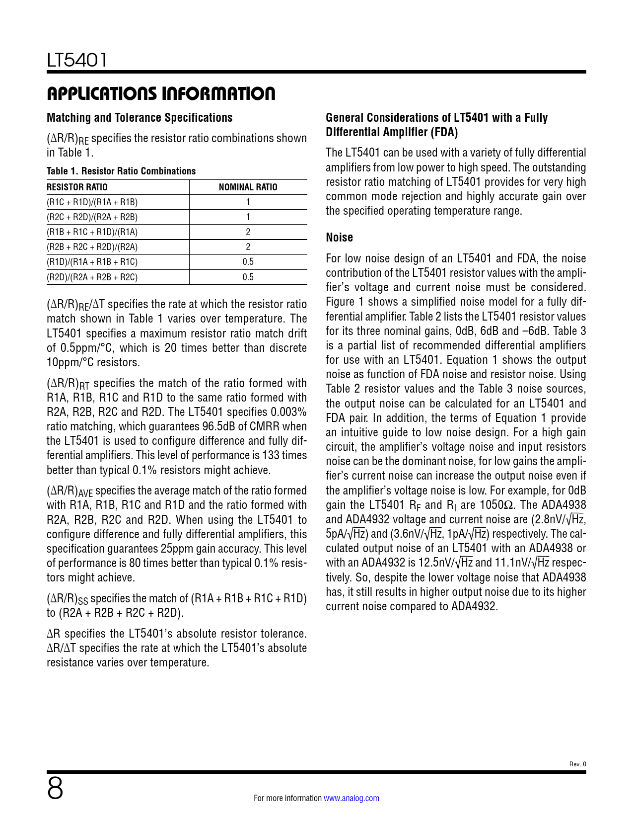 link to page 8 link to page 8 link to page 9 link to page 9 link to page 9 link to page 9 link to page 9 link to page 9 link to page 9 LT5401 APPLICATIONS INFORMATION Matching and Tolerance SpecificationsGeneral Considerations of LT5401 with a Fully (∆R/R) Differential Amplifier (FDA) RE specifies the resistor ratio combinations shown in Table 1. The LT5401 can be used with a variety of fully differential Table 1. Resistor Ratio Combinations amplifiers from low power to high speed. The outstanding RESISTOR RATIONOMINAL RATIO resistor ratio matching of LT5401 provides for very high common mode rejection and highly accurate gain over (R1C + R1D)/(R1A + R1B) 1 the specified operating temperature range. (R2C + R2D)/(R2A + R2B) 1 (R1B + R1C + R1D)/(R1A) 2 Noise (R2B + R2C + R2D)/(R2A) 2 (R1D)/(R1A + R1B + R1C) 0.5 For low noise design of an LT5401 and FDA, the noise (R2D)/(R2A + R2B + R2C) 0.5 contribution of the LT5401 resistor values with the ampli- fier’s voltage and current noise must be considered. (∆R/R)RE/∆T specifies the rate at which the resistor ratio Figure 1 shows a simplified noise model for a fully dif- match shown in Table 1 varies over temperature. The ferential amplifier. Table 2 lists the LT5401 resistor values LT5401 specifies a maximum resistor ratio match drift for its three nominal gains, 0dB, 6dB and –6dB. Table 3 of 0.5ppm/°C, which is 20 times better than discrete is a partial list of recommended differential amplifiers 10ppm/°C resistors. for use with an LT5401. Equation 1 shows the output noise as function of FDA noise and resistor noise. Using (∆R/R)RT specifies the match of the ratio formed with Table 2 resistor values and the Table 3 noise sources, R1A, R1B, R1C and R1D to the same ratio formed with the output noise can be calculated for an LT5401 and R2A, R2B, R2C and R2D. The LT5401 specifies 0.003% FDA pair. In addition, the terms of Equation 1 provide ratio matching, which guarantees 96.5dB of CMRR when an intuitive guide to low noise design. For a high gain the LT5401 is used to configure difference and fully dif- circuit, the amplifier’s voltage noise and input resistors ferential amplifiers. This level of performance is 133 times noise can be the dominant noise, for low gains the ampli- better than typical 0.1% resistors might achieve. fier’s current noise can increase the output noise even if (∆R/R)AVE specifies the average match of the ratio formed the amplifier’s voltage noise is low. For example, for 0dB with R1A, R1B, R1C and R1D and the ratio formed with gain the LT5401 RF and RI are 1050Ω. The ADA4938 R2A, R2B, R2C and R2D. When using the LT5401 to and ADA4932 voltage and current noise are (2.8nV/√Hz, configure difference and fully differential amplifiers, this 5pA/√Hz) and (3.6nV/√Hz, 1pA/√Hz) respectively. The cal- specification guarantees 25ppm gain accuracy. This level culated output noise of an LT5401 with an ADA4938 or of performance is 80 times better than typical 0.1% resis- with an ADA4932 is 12.5nV/√Hz and 11.1nV/√Hz respec- tors might achieve. tively. So, despite the lower voltage noise that ADA4938 (∆R/R) has, it still results in higher output noise due to its higher SS specifies the match of (R1A + R1B + R1C + R1D) to (R2A + R2B + R2C + R2D). current noise compared to ADA4932. ∆R specifies the LT5401’s absolute resistor tolerance. ∆R/∆T specifies the rate at which the LT5401’s absolute resistance varies over temperature. Rev. 0 8 For more information www.analog.com Document Outline Features Applications Typical Application Description Absolute Maximum Ratings Order Information Pin Configuration Electrical Characteristics Typical Performance Characteristics Pin Functions Block Diagram Applications Information Typical Applications Package Description Typical Application Related Parts