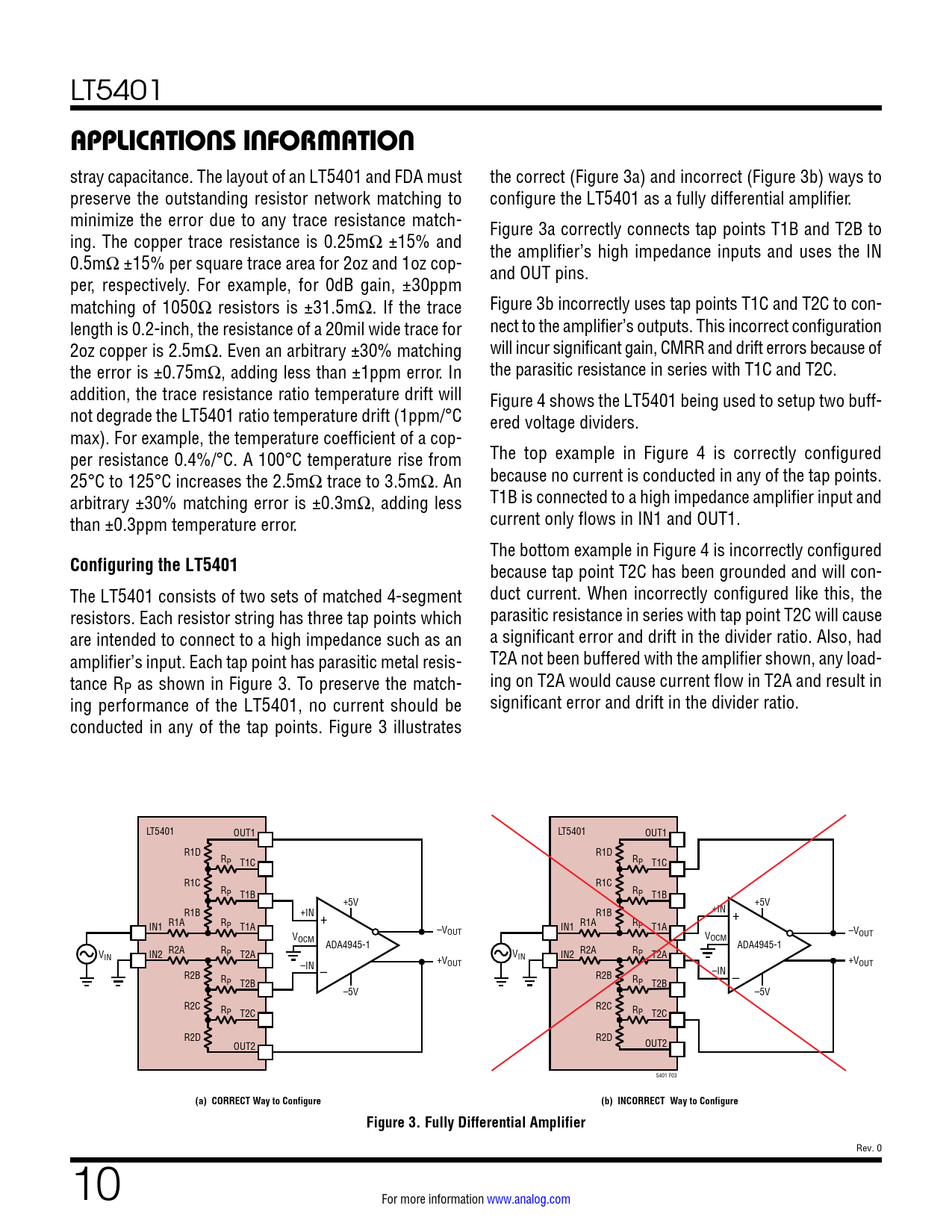 stray capacitance. The layout of an LT5401 and FDA must the correct (Figure 3a) and incorrect (Figure 3b) ways to preserve the outstanding resistor network matching to configure the LT5401 as a fully differential amplifier. minimize the error due to any trace resistance match- Figure 3a correctly connects tap points T1B and T2B to ing. The copper trace resistance is 0.25mΩ ±15% and the amplifier’s high impedance inputs and uses the IN 0.5mΩ ±15% per square trace area for 2oz and 1oz cop- and OUT pins. per, respectively. For example, for 0dB gain, ±30ppm matching of 1050Ω resistors is ±31.5mΩ. If the trace Figure 3b incorrectly uses tap points T1C and T2C to con- length is 0.2-inch, the resistance of a 20mil wide trace for nect to the amplifier’s outputs. This incorrect configuration 2oz copper is 2.5mΩ. Even an arbitrary ±30% matching will incur significant gain, CMRR and drift errors because of the error is ±0.75mΩ, adding less than ±1ppm error. In the parasitic resistance in series with T1C and T2C. addition, the trace resistance ratio temperature drift will Figure 4 shows the LT5401 being used to setup two buff- not degrade the LT5401 ratio temperature drift (1ppm/°C ered voltage dividers. max). For example, the temperature coefficient of a cop- per resistance 0.4%/°C. A 100°C temperature rise from The top example in Figure  4 is correctly configured 25°C to 125°C increases the 2.5mΩ trace to 3.5mΩ. An because no current is conducted in any of the tap points. arbitrary ±30% matching error is ±0.3mΩ, adding less T1B is connected to a high impedance amplifier input and than ±0.3ppm temperature error. current only flows in IN1 and OUT1. The bottom example in Figure 4 is incorrectly configured