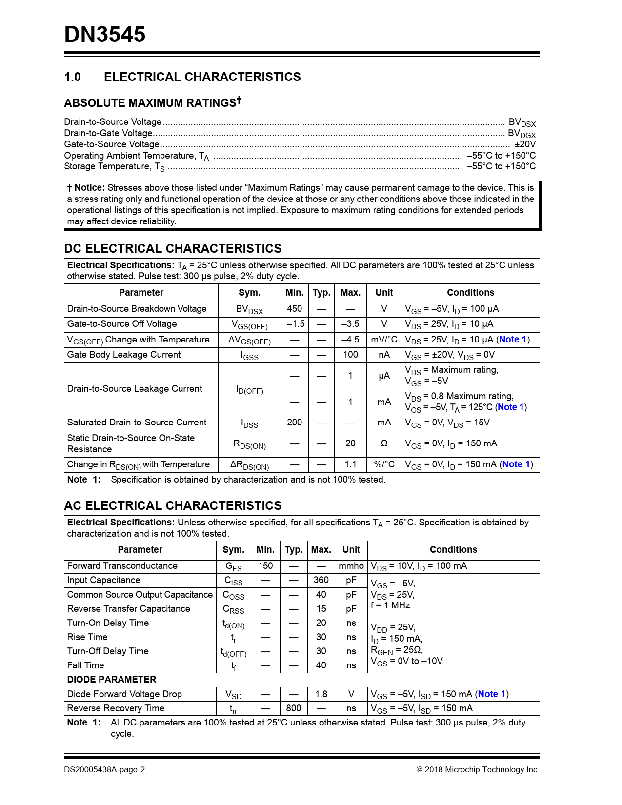 DN3545. 1.0. ELECTRICAL CHARACTERISTICS. ABSOLUTE MAXIMUM RATINGS†. † Notice:. DC ELECTRICAL CHARACTERISTICS