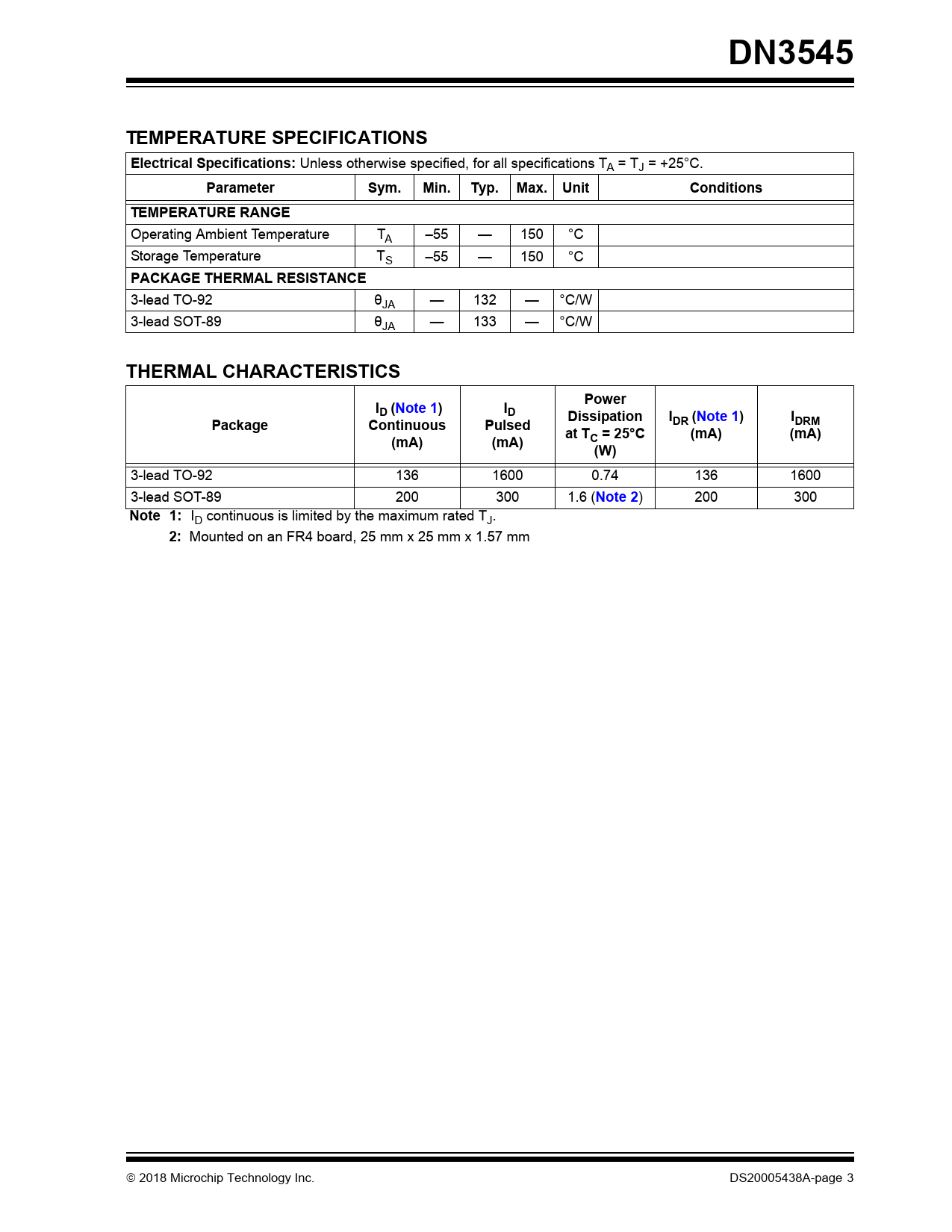DN3545 TEMPERATURE SPECIFICATIONS Electrical Specifications: