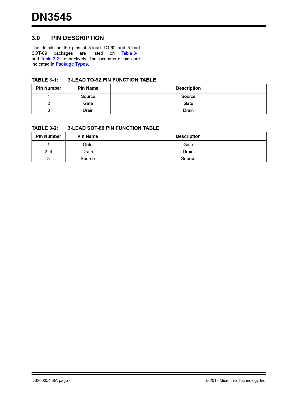 DN3545. 3.0. PIN DESCRIPTION. Package Types. TABLE 3-1:. 3-LEAD TO-92 PIN FUNCTION TABLE. Pin Number. Pin Name. Description. TABLE 3-2: