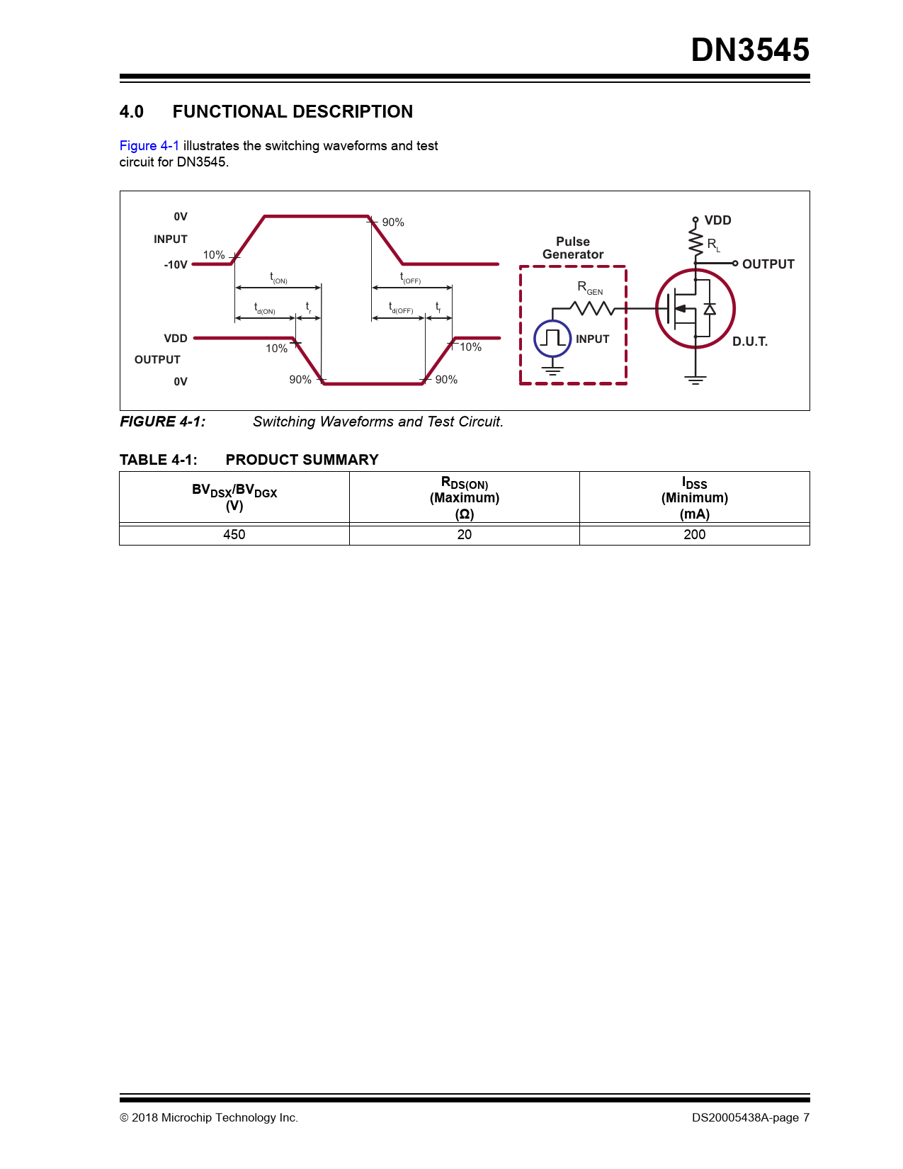 link to page 7 DN35454.0FUNCTIONAL DESCRIPTION Figure 4-1 illustrates the switching waveforms and test circuit for DN3545. 0V 90% VDDINPUTPulse R 10% Generator L -10VOUTPUT t t (ON) (OFF) RGEN t t t t d(ON) r d(OFF) f VDDINPUTD.U.T. 10% 10% OUTPUT0V 90% 90% FIGURE 4-1: Switching Waveforms and Test Circuit. TABLE 4-1:PRODUCT SUMMARYRIBVDS(ON)DSSDSX/BVDGX(Maximum)(Minimum)(V)(Ω)(mA) 450 20 200 2018 Microchip Technology Inc. DS20005438A-page 7 Document Outline 1.0 Electrical Characteristics 2.0 Typical Performance Curves FIGURE 2-1: Output Characteristics. FIGURE 2-2: Transconductance vs. Drain Current. FIGURE 2-3: Maximum Rated Safe Operating Area. FIGURE 2-4: Saturation Characteristics. FIGURE 2-5: Power Dissipation vs. Ambient Temperature. FIGURE 2-6: Thermal Response Characteristics. FIGURE 2-7: BVDSS Variation with Temperature. FIGURE 2-8: Transfer Characteristics. FIGURE 2-9: Capacitance vs. Drain-to- Source Voltage. FIGURE 2-10: On-Resistance vs. Drain Current. FIGURE 2-11: VGS(th) and RDS(ON) Variation with Temperature. FIGURE 2-12: Gate Drive Dynamic Characteristics. 3.0 Pin Description TABLE 3-1: 3-lead TO-92 Pin Function Table TABLE 3-2: 3-lead SOT-89 Pin Function Table 4.0 Functional Description FIGURE 4-1: Switching Waveforms and Test Circuit. TABLE 4-1: Product Summary 5.0 Packaging Information 5.1 Package Marking Information AMERICAS Corporate Office Atlanta Austin, TX Boston Chicago Dallas Detroit Houston, TX Indianapolis Los Angeles Raleigh, NC New York, NY San Jose, CA Canada - Toronto ASIA/PACIFIC Australia - Sydney China - Beijing China - Chengdu China - Chongqing China - Dongguan China - Guangzhou China - Hangzhou China - Hong Kong SAR China - Nanjing China - Qingdao China - Shanghai China - Shenyang China - Shenzhen China - Suzhou China - Wuhan China - Xian China - Xiamen China - Zhuhai ASIA/PACIFIC India - Bangalore India - New Delhi India - Pune Japan - Osaka Japan - Tokyo Korea - Daegu Korea - Seoul Malaysia - Kuala Lumpur Malaysia - Penang Philippines - Manila Singapore Taiwan - Hsin Chu Taiwan - Kaohsiung Taiwan - Taipei Thailand - Bangkok Vietnam - Ho Chi Minh EUROPE Austria - Wels Denmark - Copenhagen Finland - Espoo France - Paris Germany - Garching Germany - Haan Germany - Heilbronn Germany - Karlsruhe Germany - Munich Germany - Rosenheim Israel - Ra’anana Italy - Milan Italy - Padova Netherlands - Drunen Norway - Trondheim Poland - Warsaw Romania - Bucharest Spain - Madrid Sweden - Gothenberg Sweden - Stockholm UK - Wokingham