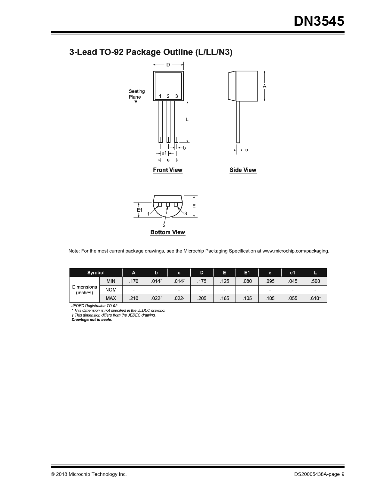 Note: For the most current package drawings, see the Microchip Packaging Specification at www.microchip.com/packaging.  2018 Microchip Technology Inc. DS20005438A-page 9 Document Outline 1.0 Electrical Characteristics 2.0 Typical Performance Curves FIGURE 2-1: Output Characteristics. FIGURE 2-2: Transconductance vs. Drain Current. FIGURE 2-3: Maximum Rated Safe Operating Area. FIGURE 2-4: Saturation Characteristics. FIGURE 2-5: Power Dissipation vs. Ambient Temperature. FIGURE 2-6: Thermal Response Characteristics. FIGURE 2-7: BVDSS Variation with Temperature. FIGURE 2-8: Transfer Characteristics. FIGURE 2-9: Capacitance vs. Drain-to- Source Voltage. FIGURE 2-10: On-Resistance vs. Drain Current. FIGURE 2-11: VGS(th) and RDS(ON) Variation with Temperature. FIGURE 2-12: Gate Drive Dynamic Characteristics. 3.0 Pin Description TABLE 3-1: 3-lead TO-92 Pin Function Table TABLE 3-2: 3-lead SOT-89 Pin Function Table 4.0 Functional Description FIGURE 4-1: Switching Waveforms and Test Circuit. TABLE 4-1: Product Summary 5.0 Packaging Information 5.1 Package Marking Information AMERICAS Corporate Office Atlanta Austin, TX Boston Chicago Dallas Detroit Houston, TX Indianapolis Los Angeles Raleigh, NC New York, NY San Jose, CA Canada - Toronto ASIA/PACIFIC Australia - Sydney China - Beijing China - Chengdu China - Chongqing China - Dongguan China - Guangzhou China - Hangzhou China - Hong Kong SAR China - Nanjing China - Qingdao China - Shanghai China - Shenyang China - Shenzhen China - Suzhou China - Wuhan China - Xian China - Xiamen China - Zhuhai ASIA/PACIFIC India - Bangalore India - New Delhi India - Pune Japan - Osaka Japan - Tokyo Korea - Daegu Korea - Seoul Malaysia - Kuala Lumpur Malaysia - Penang Philippines - Manila Singapore Taiwan - Hsin Chu Taiwan - Kaohsiung Taiwan - Taipei Thailand - Bangkok Vietnam - Ho Chi Minh EUROPE Austria - Wels Denmark - Copenhagen Finland - Espoo France - Paris Germany - Garching Germany - Haan Germany - Heilbronn Germany - Karlsruhe Germany - Munich Germany - Rosenheim Israel - Ra’anana Italy - Milan Italy - Padova Netherlands - Drunen Norway - Trondheim Poland - Warsaw Romania - Bucharest Spain - Madrid Sweden - Gothenberg Sweden - Stockholm UK - Wokingham