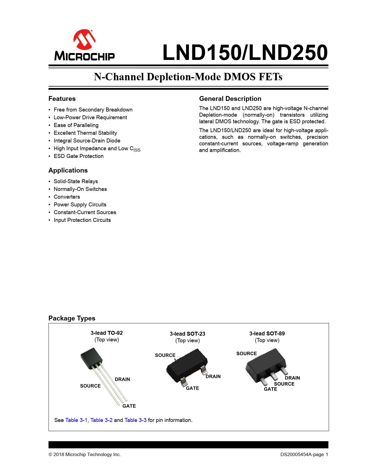 LND150/LND250. N-Channel Depletion-Mode DMOS FETs. Features. General Description. Applications. Package Types. 3-lead TO-92