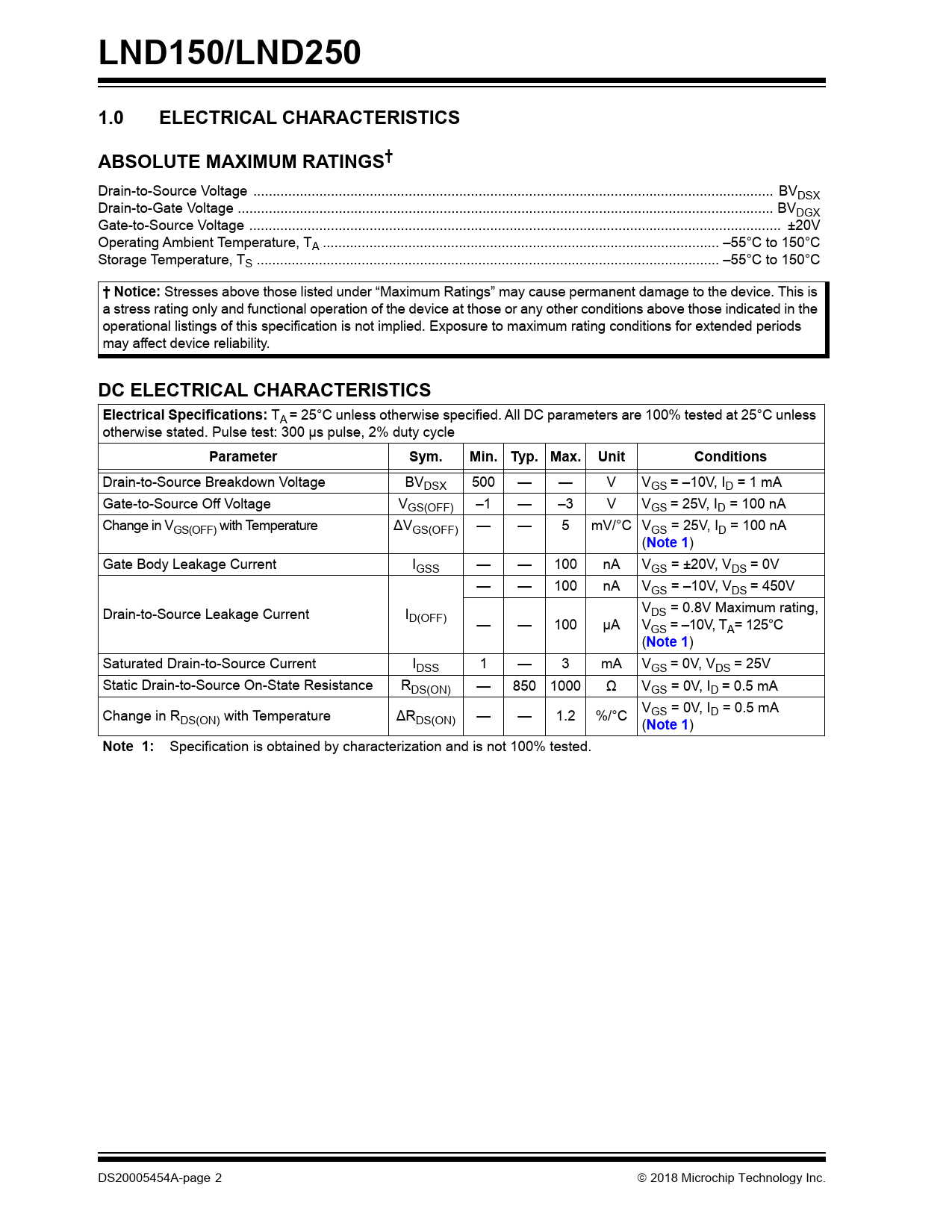 link to page 2 link to page 2 link to page 2 LND150/LND2501.0ELECTRICAL CHARACTERISTICSABSOLUTE MAXIMUM RATINGS† Drain-to-Source Voltage .. BVDSX Drain-to-Gate Voltage .. BVDGX Gate-to-Source Voltage ... ±20V Operating Ambient Temperature, TA .. –55°C to 150°C Storage Temperature, TS ... –55°C to 150°C † Notice: Stresses above those listed under “Maximum Ratings” may cause permanent damage to the device. This is a stress rating only and functional operation of the device at those or any other conditions above those indicated in the operational listings of this specification is not implied. Exposure to maximum rating conditions for extended periods may affect device reliability. DC ELECTRICAL CHARACTERISTICSElectrical Specifications: TA = 25°C unless otherwise specified. All DC parameters are 100% tested at 25°C unless otherwise stated. Pulse test: 300 µs pulse, 2% duty cycle ParameterSym.Min. Typ. Max.UnitConditions Drain-to-Source Breakdown Voltage BVDSX 500 — — V VGS = –10V, ID = 1 mA Gate-to-Source Off Voltage VGS(OFF) –1 — –3 V VGS = 25V, ID = 100 nA Change in VGS(OFF) with Temperature ∆VGS(OFF) — — 5 mV/°C VGS = 25V, ID = 100 nA ( Note 1 ) Gate Body Leakage Current IGSS — — 100 nA VGS = ±20V, VDS = 0V — — 100 nA VGS = –10V, VDS = 450V Drain-to-Source Leakage Current I VDS = 0.8V Maximum rating, D(OFF) — — 100 µA VGS = –10V, TA= 125°C ( Note 1 ) Saturated Drain-to-Source Current IDSS 1 — 3 mA VGS = 0V, VDS = 25V Static Drain-to-Source On-State Resistance RDS(ON) — 850 1000 Ω VGS = 0V, ID = 0.5 mA V Change in R GS = 0V, ID = 0.5 mA DS(ON) with Temperature ∆RDS(ON) — — 1.2 %/°C ( Note 1 ) Note 1: Specification is obtained by characterization and is not 100% tested. DS20005454A-page 2 2018 Microchip Technology Inc. Document Outline N-Channel Depletion-Mode DMOS FETs Features Applications General Description Package Types 1.0 Electrical Characteristics Absolute Maximum Ratings† DC Electrical Characteristics AC Electrical Characteristics Temperature Specifications Thermal Characteristics 2.0 Typical Performance Curves FIGURE 2-1: Output Characteristics. FIGURE 2-2: Transconductance vs. Drain Current. FIGURE 2-3: Maximum Rated Safe Operating Area. FIGURE 2-4: Saturation Characteristics. FIGURE 2-5: Power Dissipation vs. Ambient Temperature. FIGURE 2-6: Thermal Response Characteristics. FIGURE 2-7: BVDSS Variation with Temperature. FIGURE 2-8: Transfer Characteristics. FIGURE 2-9: Capacitance vs. Drain-to- Source Voltage. FIGURE 2-10: Drain Current vs. RSOURCE. FIGURE 2-11: VGS(OFF) and RDS Variation with Temperature. FIGURE 2-12: Gate Drive Dynamic Characteristics. 3.0 Pin Description TABLE 3-1: TO-92 Pin Function Table TABLE 3-2: SOT-23 Pin Function Table TABLE 3-3: SOT-89 Pin Function Table 4.0 Functional Description FIGURE 4-1: Switching Waveforms and Test Circuit. TABLE 4-1: Product Summary 5.0 Packaging Information 5.1 Package Marking Information Appendix A: Revision History Revision A (August 2018) Product Identification System Worldwide Sales and Service