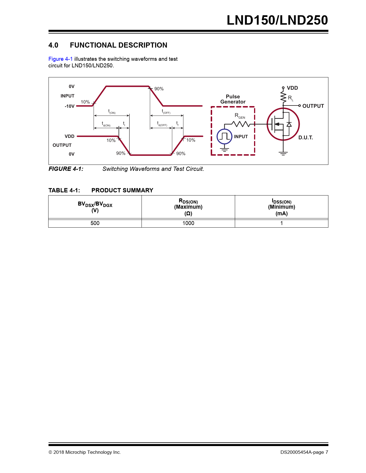 link to page 7 LND150/LND2504.0FUNCTIONAL DESCRIPTION Figure 4-1 illustrates the switching waveforms and test circuit for LND150/LND250. 0V 90% VDDINPUTPulse R 10% Generator L -10VOUTPUT t t (ON) (OFF) RGEN t t t t d(ON) r d(OFF) f VDDINPUTD.U.T. 10% 10% OUTPUT0V 90% 90% FIGURE 4-1: Switching Waveforms and Test Circuit. TABLE 4-1:PRODUCT SUMMARYRIBVDS(ON)DSS(ON)DSX/BVDGX(Maximum)(Minimum)(V)(Ω)(mA) 500 1000 1 2018 Microchip Technology Inc. DS20005454A-page 7 Document Outline N-Channel Depletion-Mode DMOS FETs Features Applications General Description Package Types 1.0 Electrical Characteristics Absolute Maximum Ratings† DC Electrical Characteristics AC Electrical Characteristics Temperature Specifications Thermal Characteristics 2.0 Typical Performance Curves FIGURE 2-1: Output Characteristics. FIGURE 2-2: Transconductance vs. Drain Current. FIGURE 2-3: Maximum Rated Safe Operating Area. FIGURE 2-4: Saturation Characteristics. FIGURE 2-5: Power Dissipation vs. Ambient Temperature. FIGURE 2-6: Thermal Response Characteristics. FIGURE 2-7: BVDSS Variation with Temperature. FIGURE 2-8: Transfer Characteristics. FIGURE 2-9: Capacitance vs. Drain-to- Source Voltage. FIGURE 2-10: Drain Current vs. RSOURCE. FIGURE 2-11: VGS(OFF) and RDS Variation with Temperature. FIGURE 2-12: Gate Drive Dynamic Characteristics. 3.0 Pin Description TABLE 3-1: TO-92 Pin Function Table TABLE 3-2: SOT-23 Pin Function Table TABLE 3-3: SOT-89 Pin Function Table 4.0 Functional Description FIGURE 4-1: Switching Waveforms and Test Circuit. TABLE 4-1: Product Summary 5.0 Packaging Information 5.1 Package Marking Information Appendix A: Revision History Revision A (August 2018) Product Identification System Worldwide Sales and Service