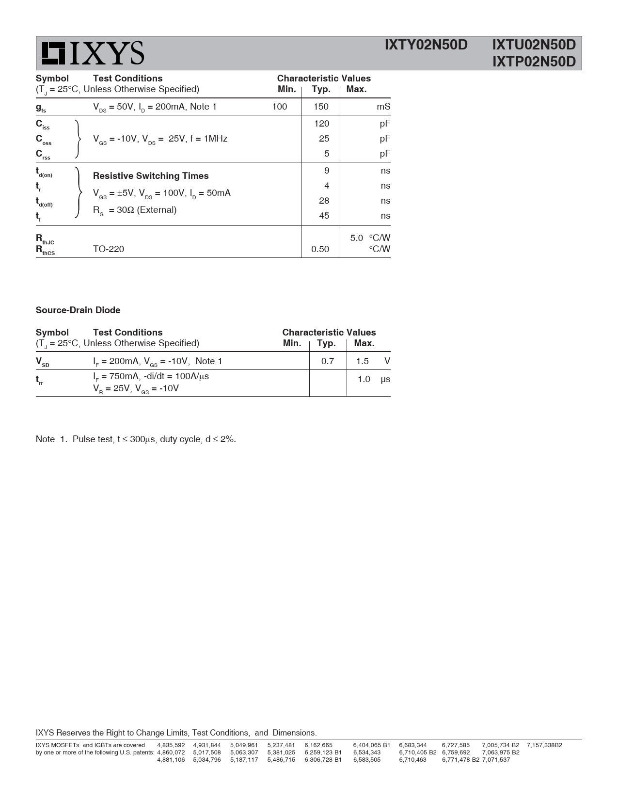 IXTY02N50D IXTU02N50D. IXTP02N50D. Symbol. Test Conditions Characteristic Values. Min. Typ. Max. iss. oss. rss. d(on)